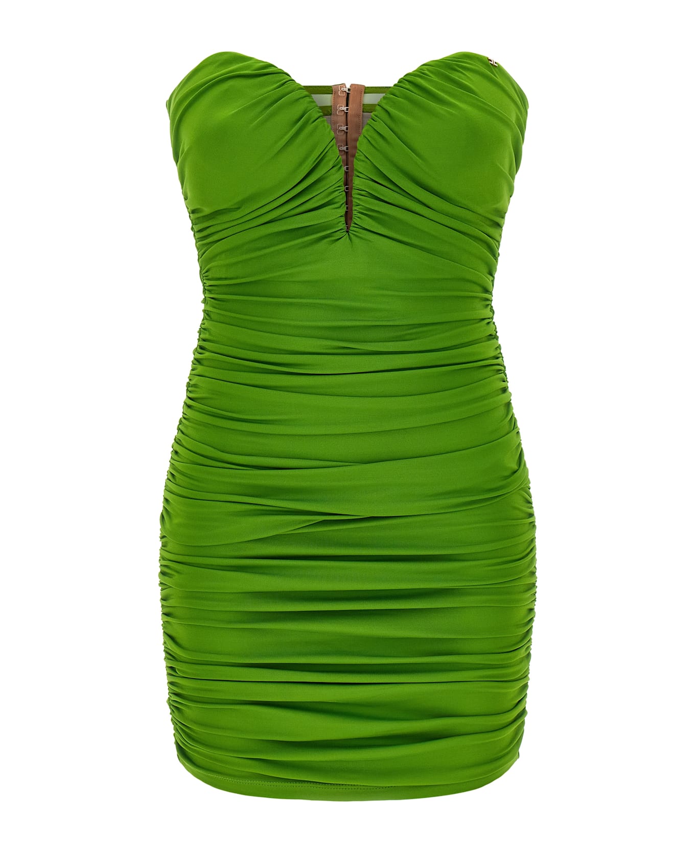 Sleeveless mini dress in crêpe jersey with draping on the front and back, off-the-shoulder style with sweetheart neckline, inner corset with preformed cups, side splints and back zip closure, metal logo with crystals on the front, back zip closure.