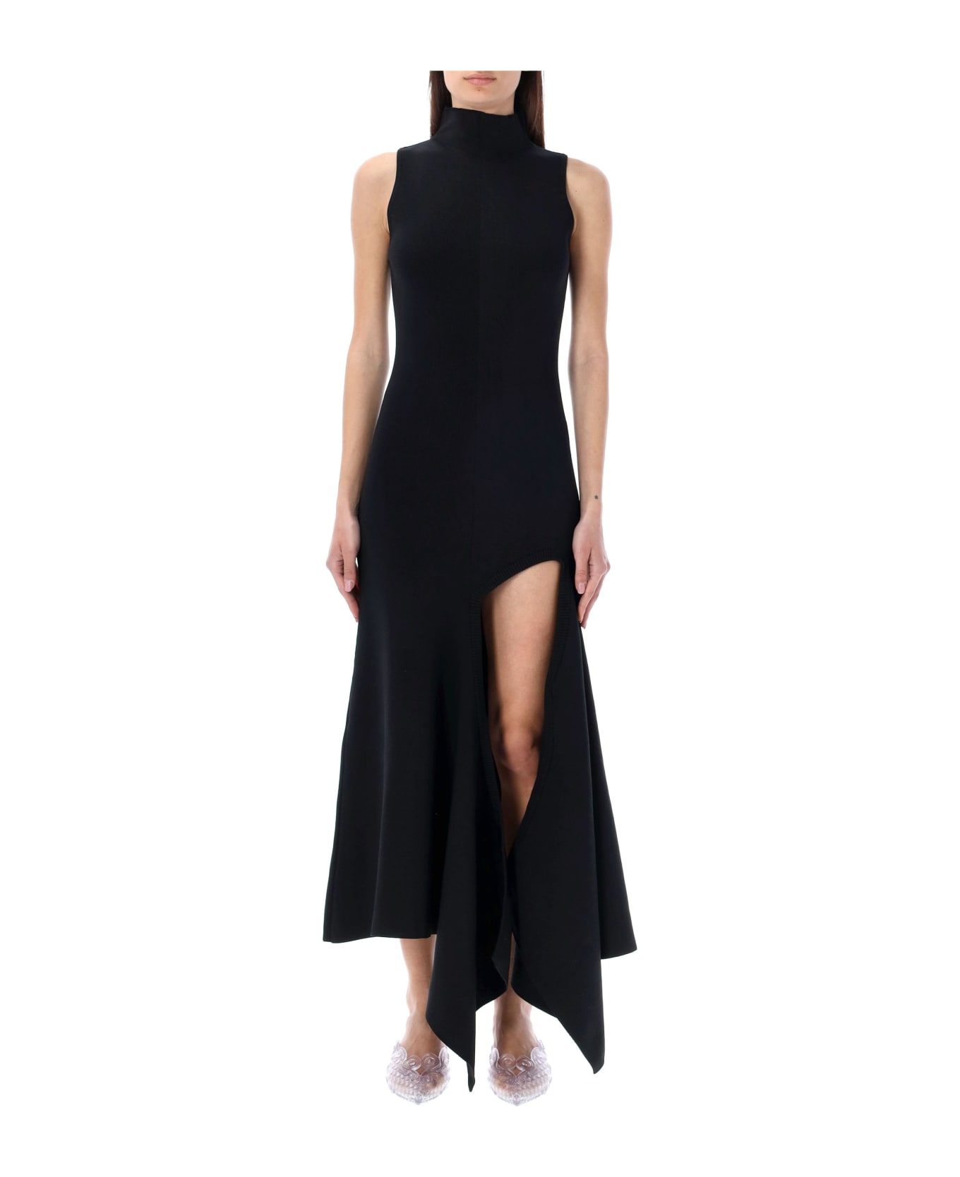 Viscose Blend High Neck Side Slit Dress By Y/project. Featuring: High Neck Sleeveless Fitted Silhouette Plunging Side Slit Asymmetric Hem Pull-on Style Model Is 1,72 M Tall And She Is Wearing Size 36