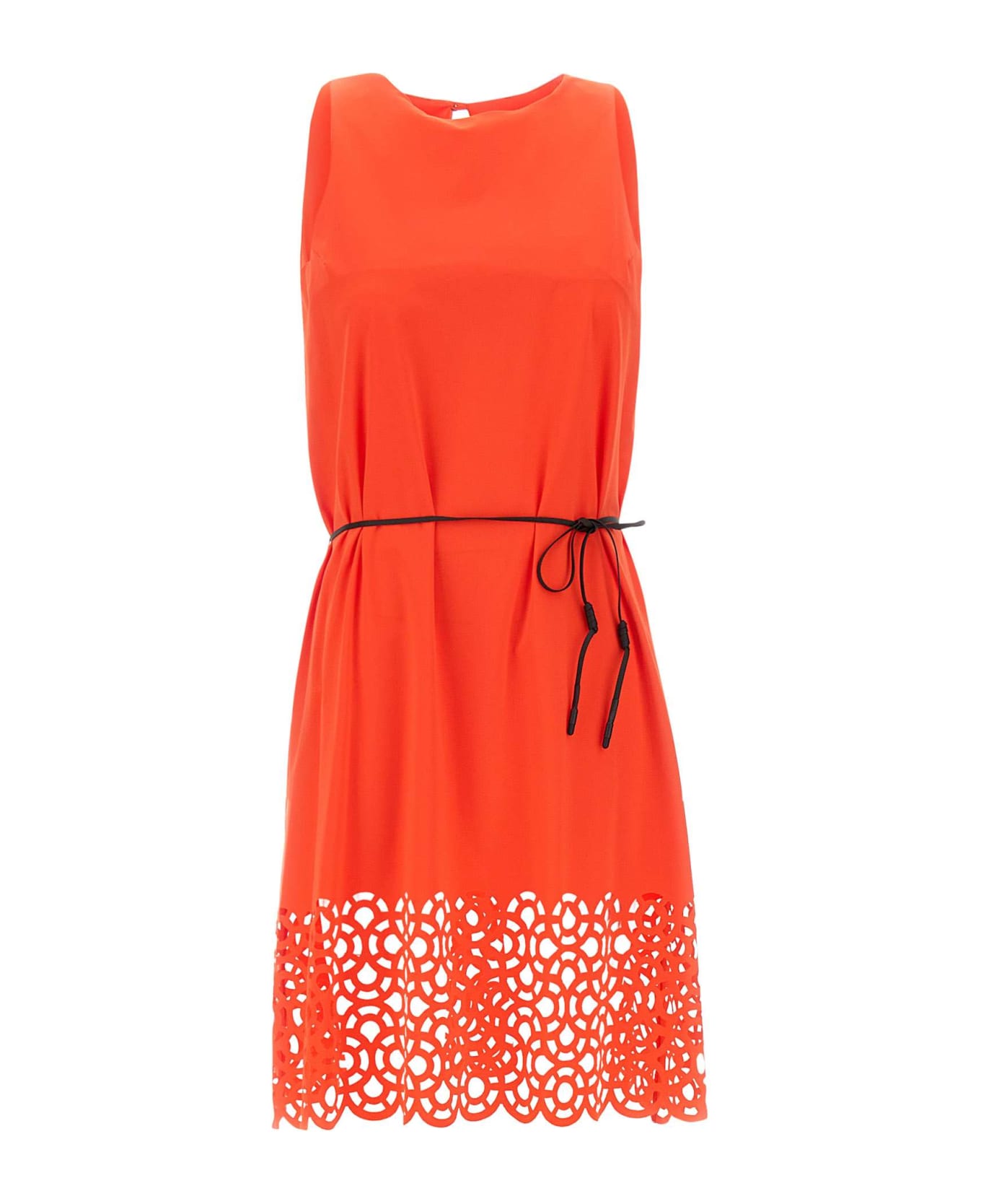 RRD "Hole Wom" woman super opaque and ultra-soft recycled SURFLEX® technical fabric dress, stretch, orange colour, lace-effect border at hem with raw cut tapis fleur design, bell-shaped line, sleeveless, button closure on back of neck, tone-on-tone belt to tie, regular fit.