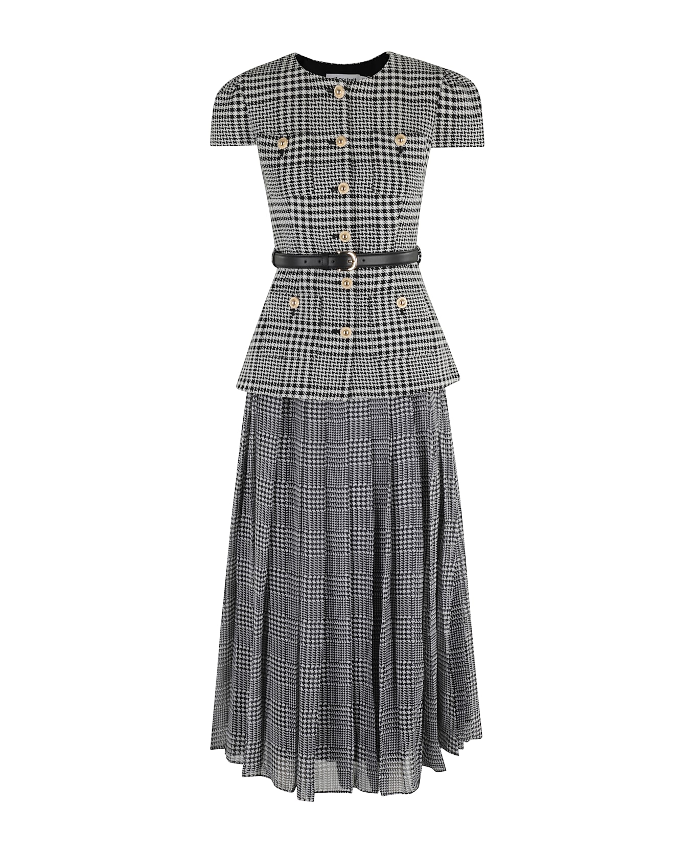 Dress - Self-Portrait - Houndstooth tailored pattern - Black and white - Short sleeves - Four front gold button pockets - Round neckline - Waist loops - Removable belt - Pleated skirt - Front button closure