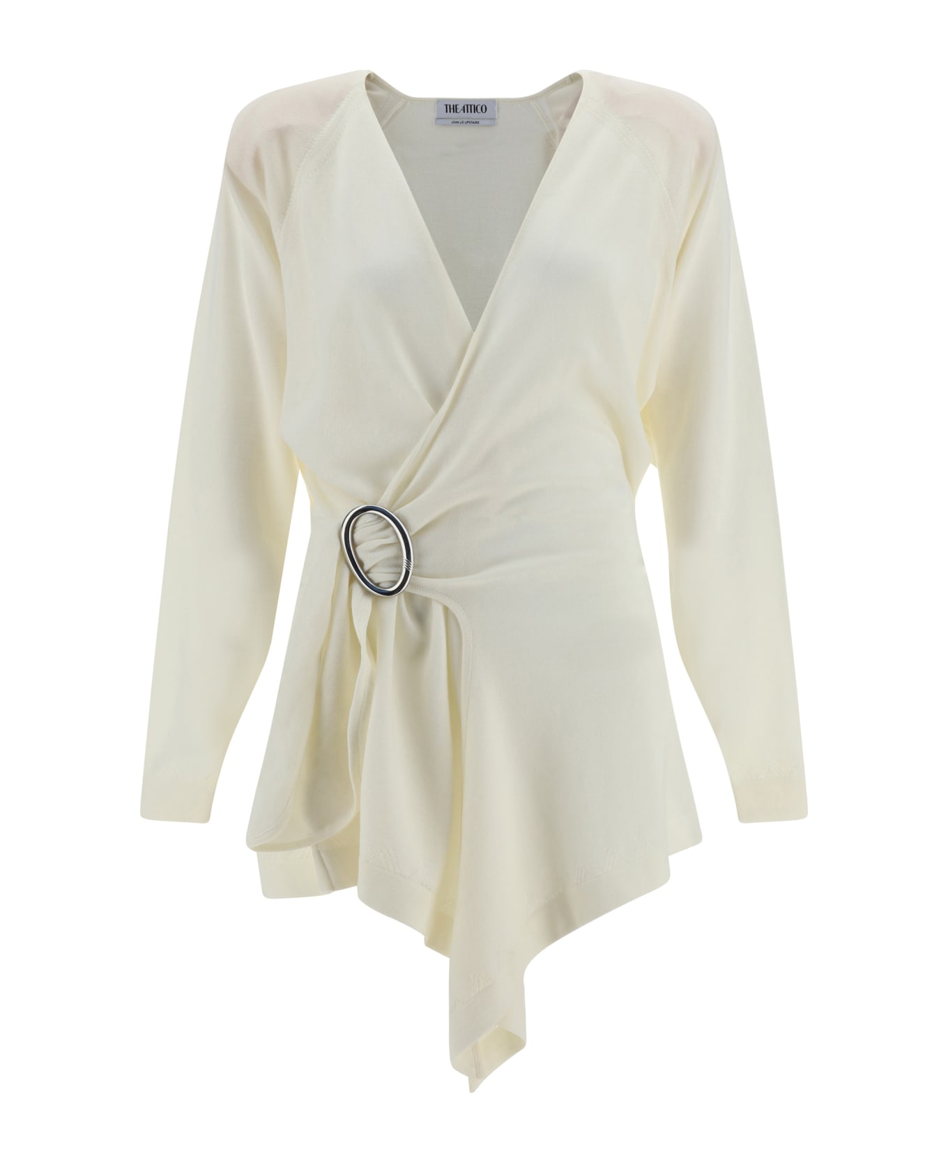 Wool hurely mini dress by the attico, wide v-neck front, heartwarming front fastening, long sleeve design, flap fastening with round front buckle, mini design, asymmetrical hemline. Composition: 100% % Wool