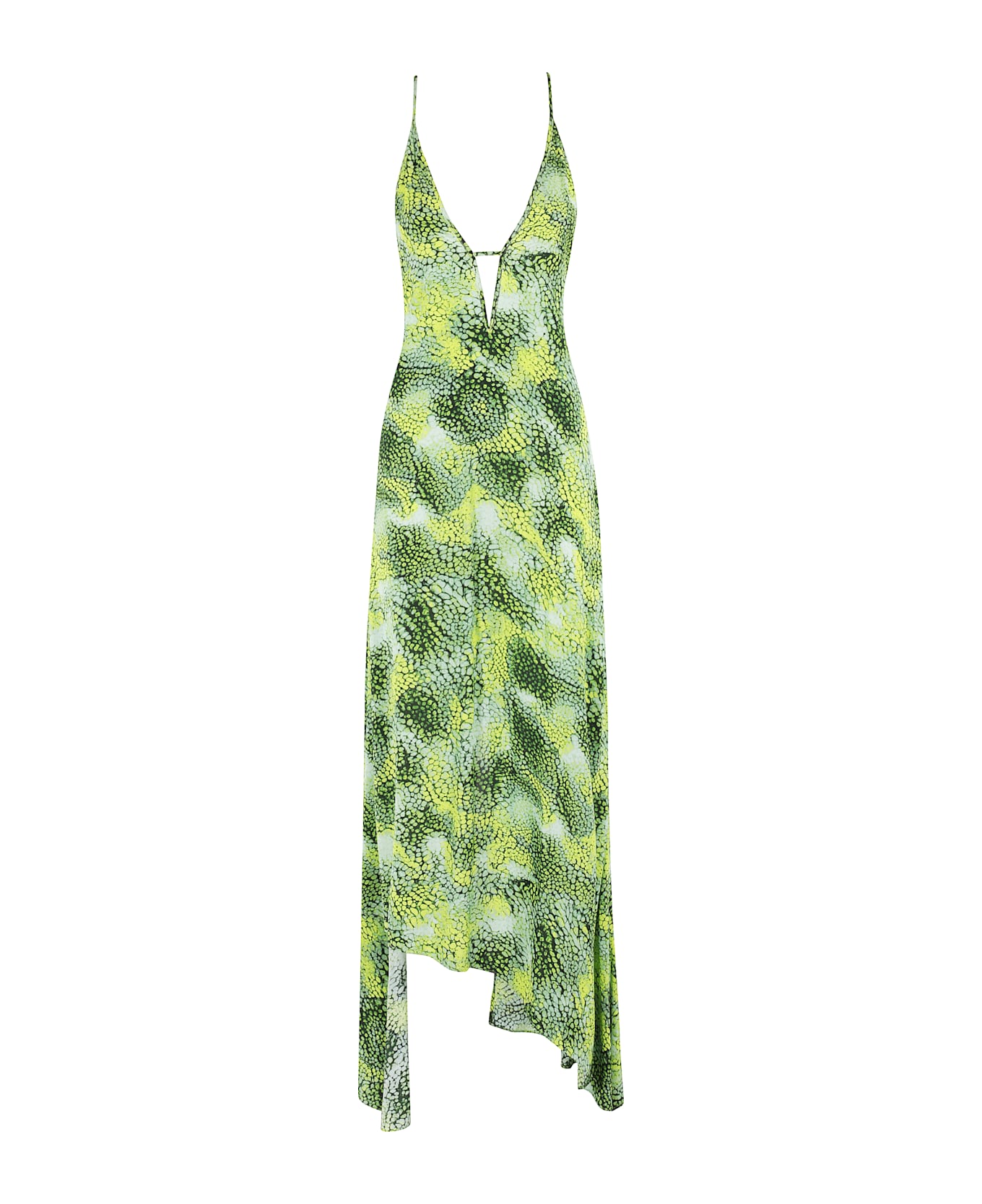 Idila dress - Iro - Green color - Fluid fabric with bubble print - V-neckline - Crisscross back straps - Asymmetrical hemline with back slit - Loose fit.