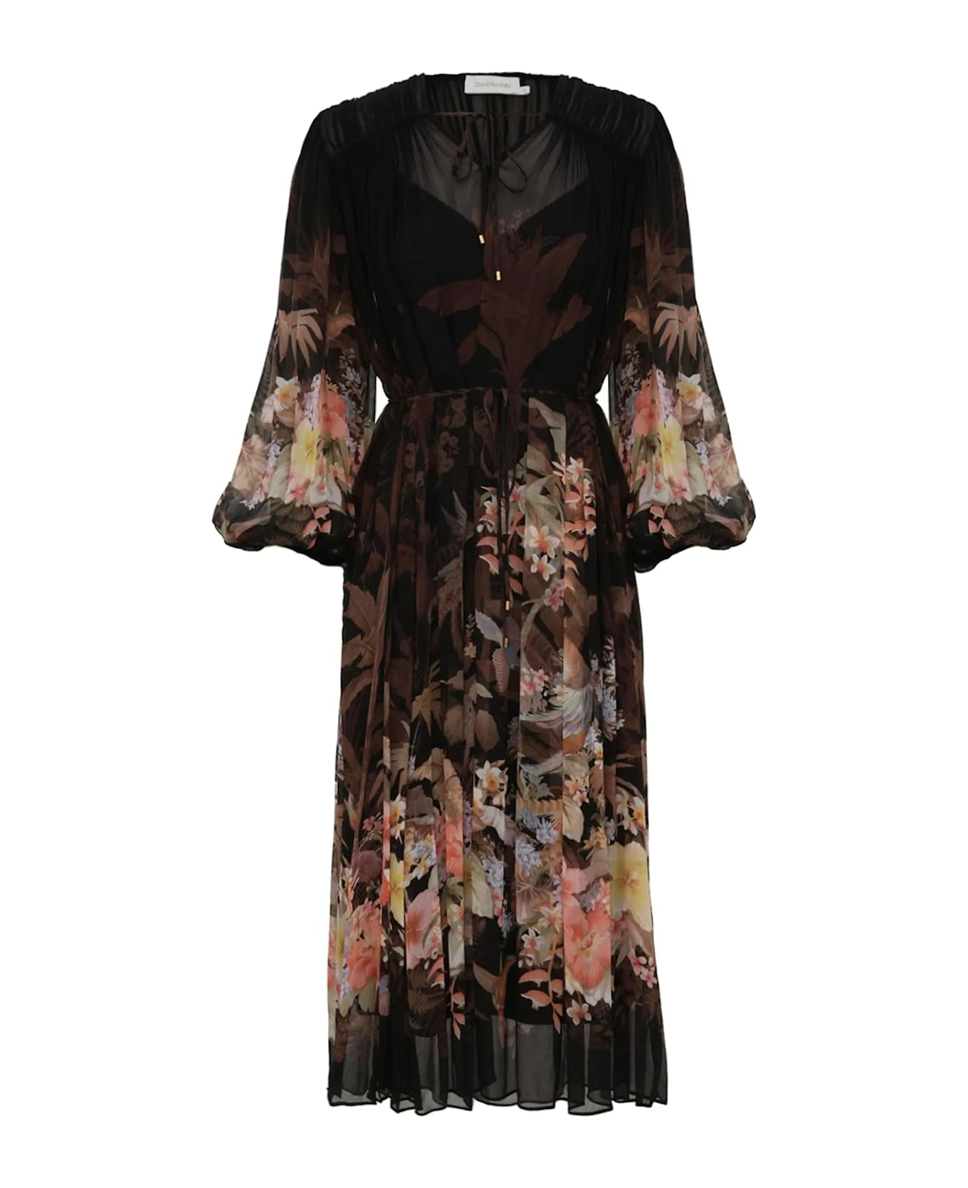 Black tie front closure dress all-over floral print V-neck balloon sleeves