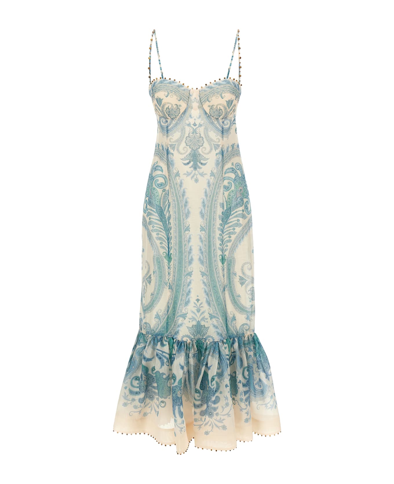 Illuminate Gown' midi dress in printed linen and silk blend, sheath dress with flounces on the hem, slightly padded cups with thin straps, back zip and hook closure and elastic, beads embroidery on the edges.