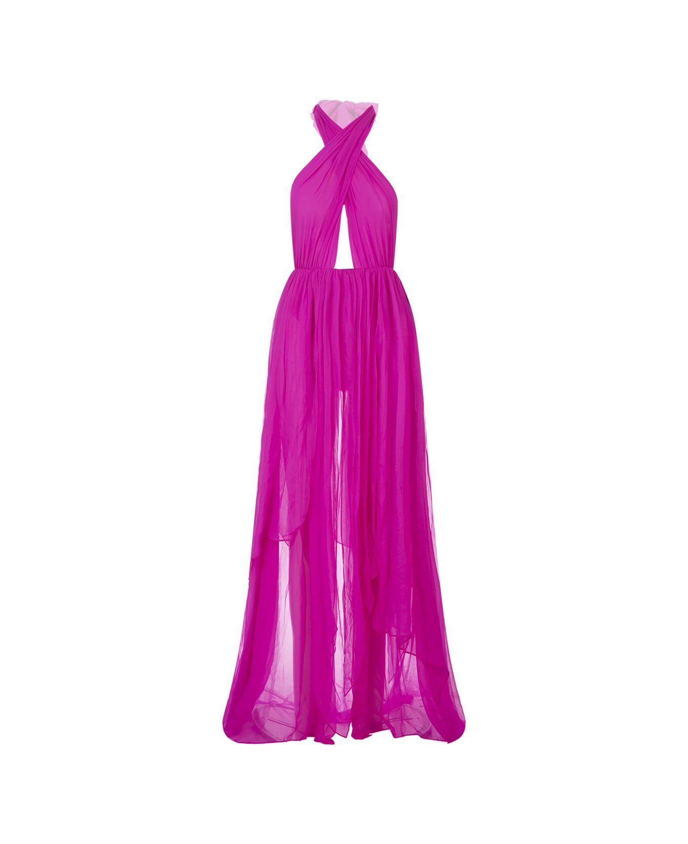 Ina long dress by Retrofete is made from neon pink silk chiffon. This bright and flowing masterpiece features a crossover neck design, a mini centre cutout and daring thigh-high slits that will turn heads.