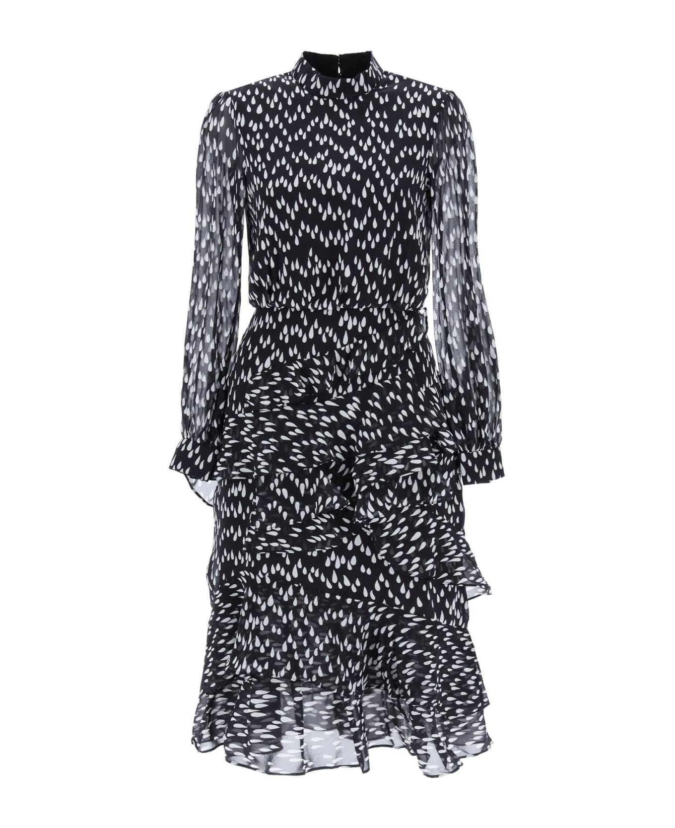 Saloni dress crafted in pure silk georgette with polka dot pattern. Characterized by a straight line with relaxed bodice and ruffled skirt, it features stand collar, puff sleeves with double-button cuffs and back invisible zipper and button closure. Lined interior. Midi length. The model is 177 cm tall and wears size UK 8. Composition: 100% SE