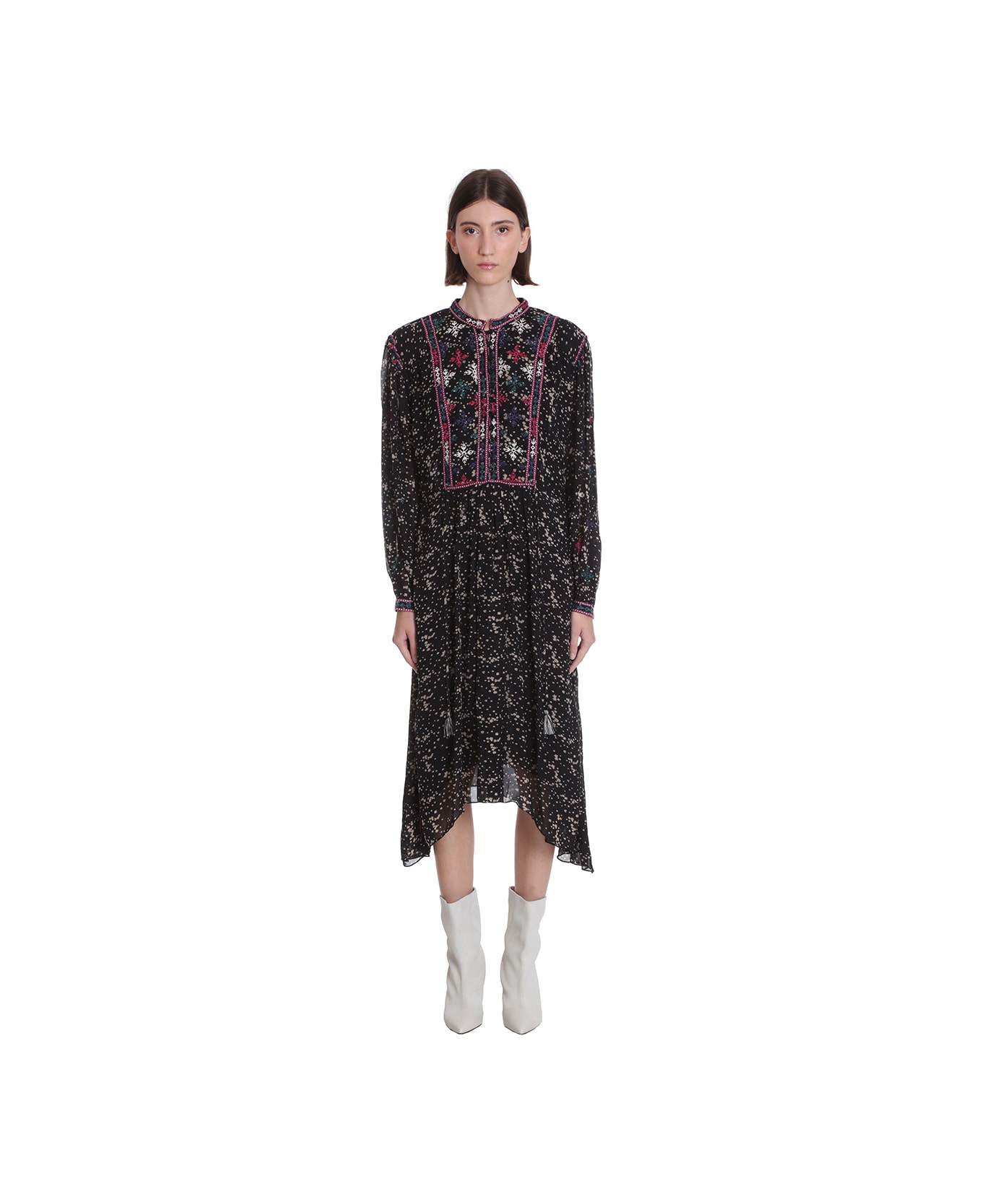 Inesia Dress in black viscose, mao collar, long sleeves, asymmetrical cut, embroidered on front, floreal print all over, 100% Viscose, Model is 180 cm and wears 38 Composition: Viscose