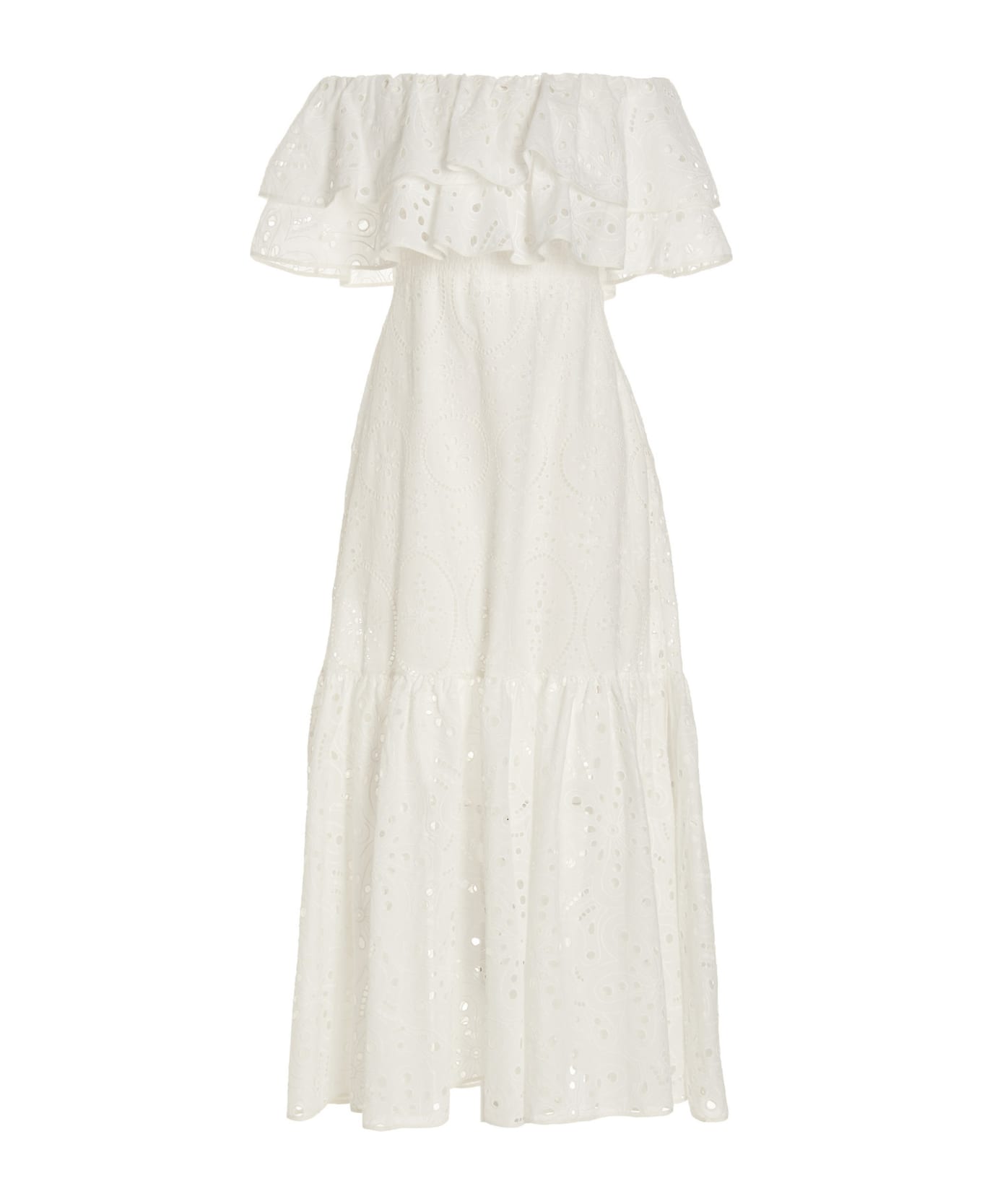 'Isabella' cotton blend dress with embroideries and openwork details, side zip closure, off-the-shoulder, elastic and flounces on the neckline, tiered skirt.