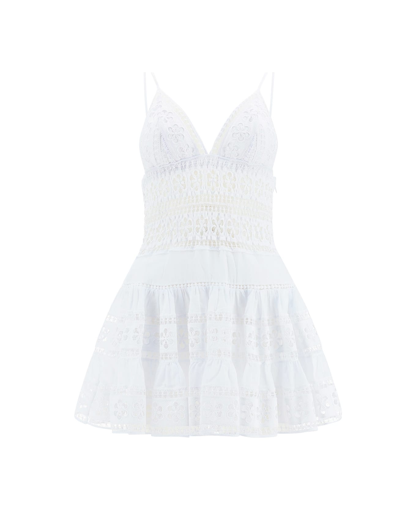 Cotton isca dress by charo ruiz, thin straps, skirt fitted with petticoat, floral lace design with cut-out details, monochrome pattern.