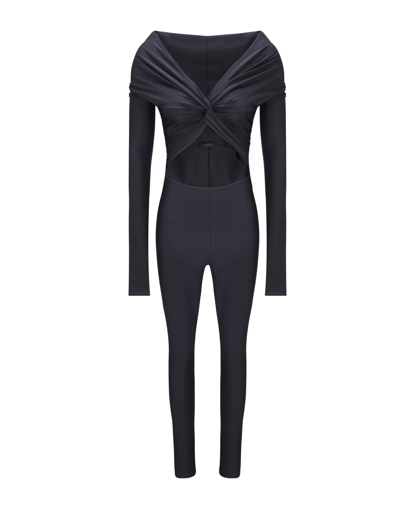 Kendall jumpsuit by the andamane, off-shoulder design with long sleeves, cross smock stitch on neckline, monochrome pattern, cut-out detail on front, stretchy fitted design, slim fit.