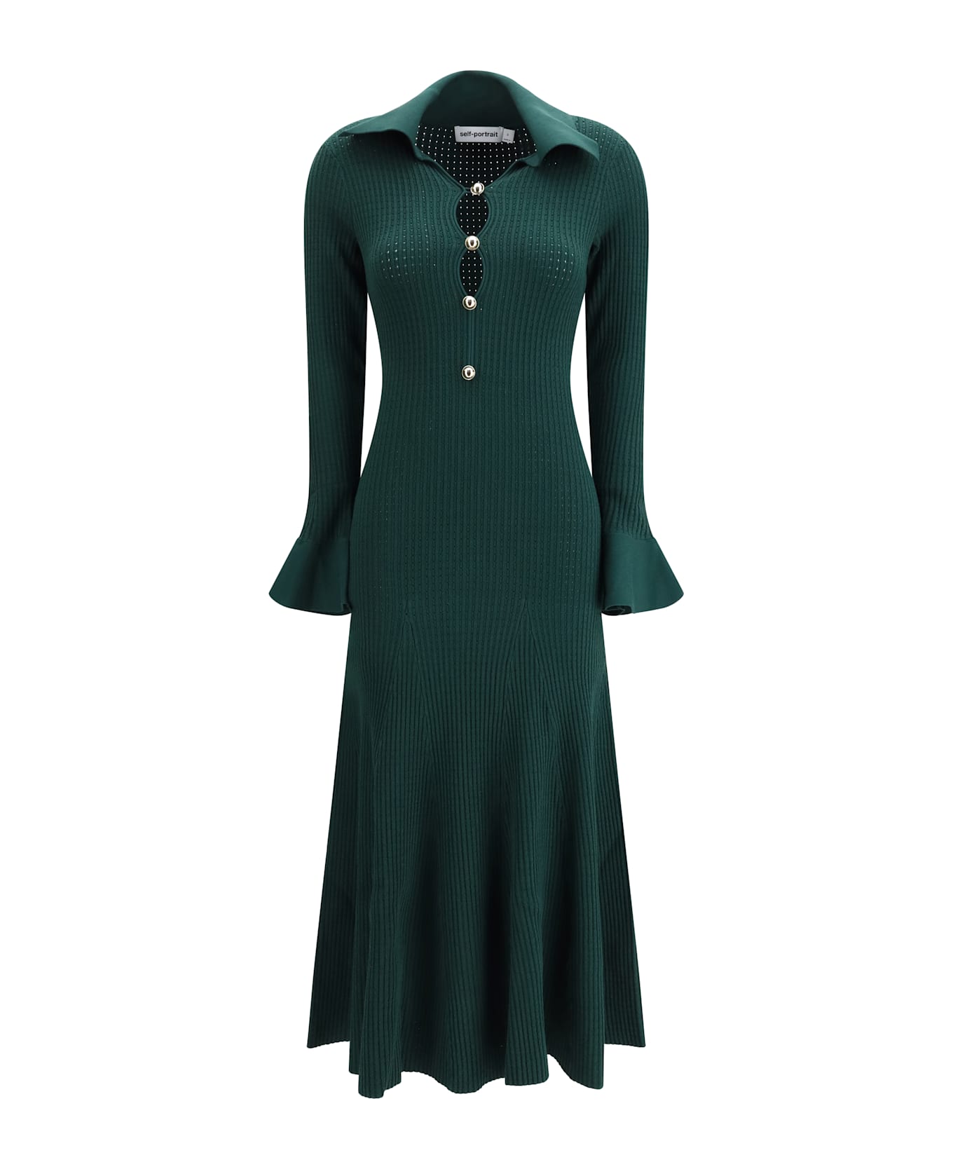 The keyhole knit midi dress by self-portrait stands out for its bold interplay of structure and decorative detail. crafted in a stretch knit that follows the body with ease, it features a sequence of keyhole cut-outs along the front, framed by refined button embellishments that add a jewellery-like accent. the exaggerated collar and softly flared cuffs enhance the silhouette with a sense of movement and personality, creating a piece that transitions effortlessly from day to evening.
