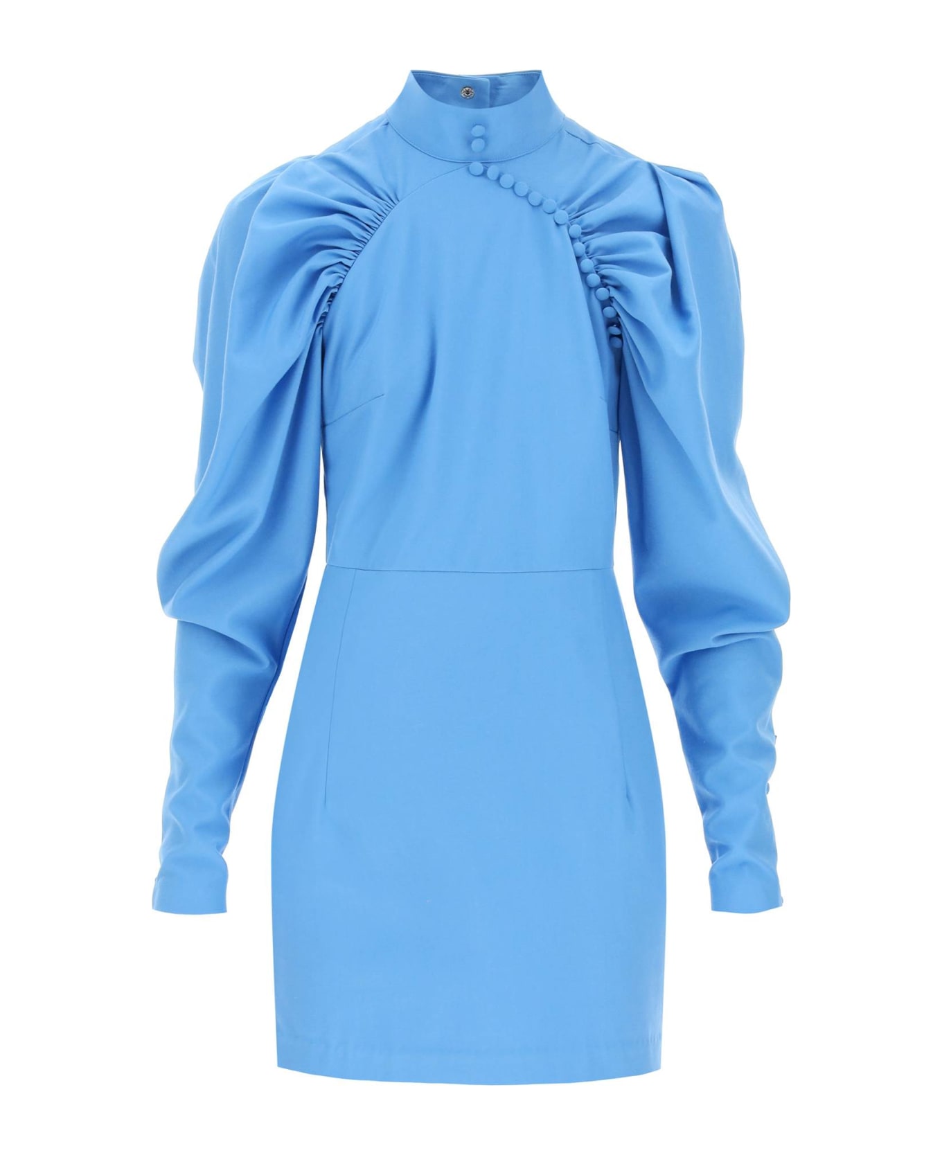 Rotate viscose-blend twill mini dress, characterized by puff draped sleeves with decorative self-cover buttons and mock neck with back press studs. Rear invisible zip closure with R puller. The model is 177 cm tall and wears a size EU 34.