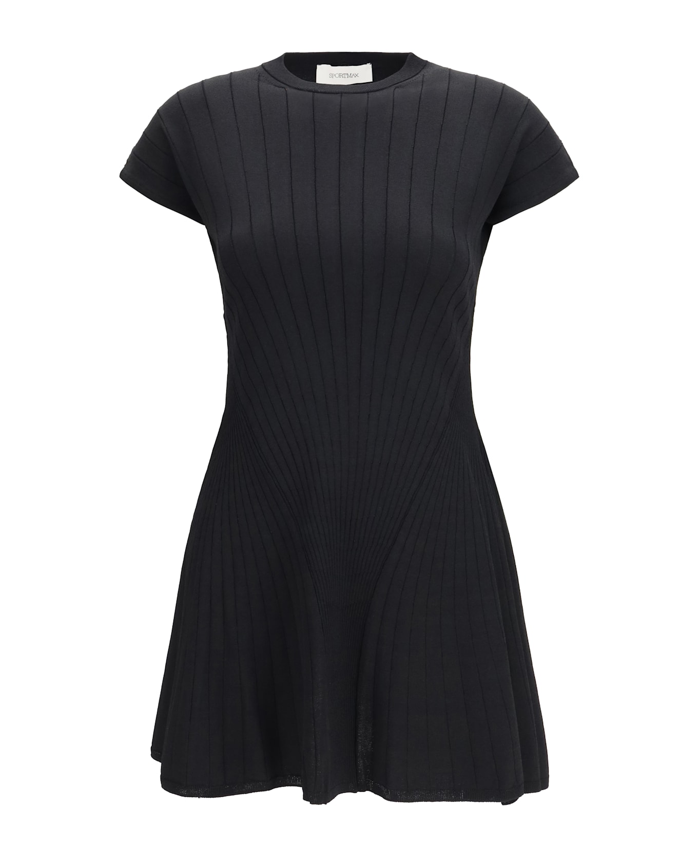 The knitted mini dress by max mara sportmax embodies a modern, dynamic femininity. crafted from a viscose-blend knit, it features a radiating jacquard pattern that enhances the structure of the piece. the silhouette is fitted at the waist and flares into a skirt, finished with short flutter sleeves. a crew neckline, sleeve hems, and bottom hem trimmed in micro ribbing complete the design with a clean, contemporary finish.