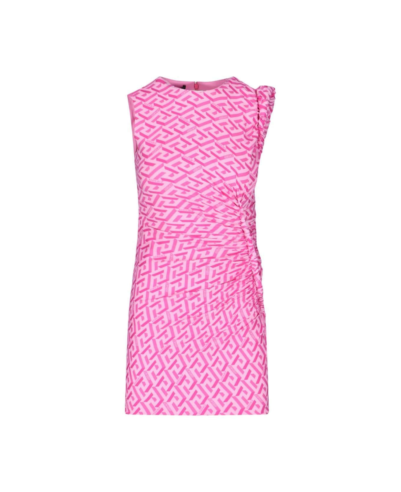 Versace 'La Greca' pink fabric sleveless scoop neck sheath minidress with fuchsia pink details, all-over 'la greca' print, back zip closure, twist detail on the sleeve and front, straight hem.