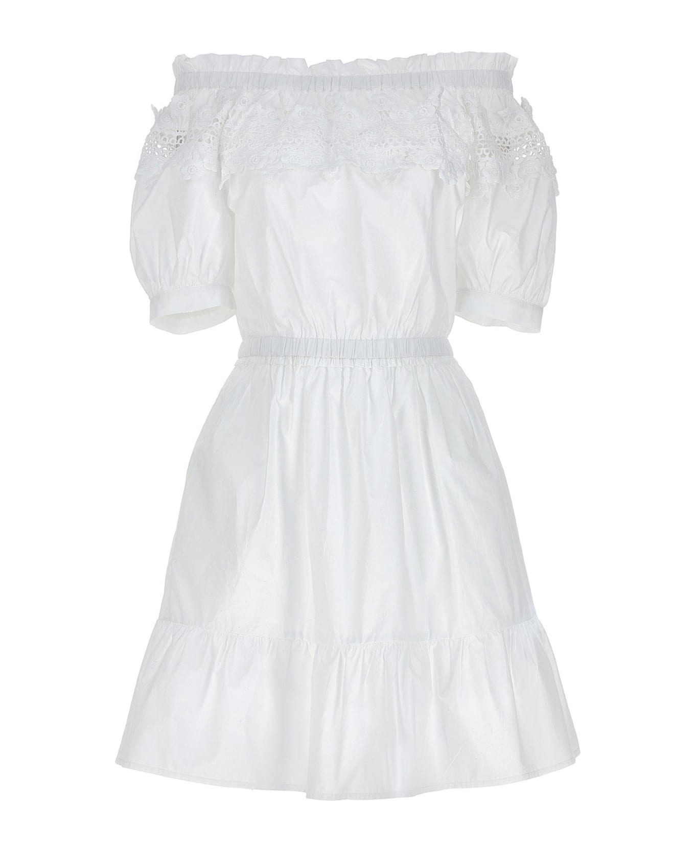 Cotton poplin dress with lace details, off-the-shoulder style with 3/4 sleeves, elastic waistband and a metal logo at the back.