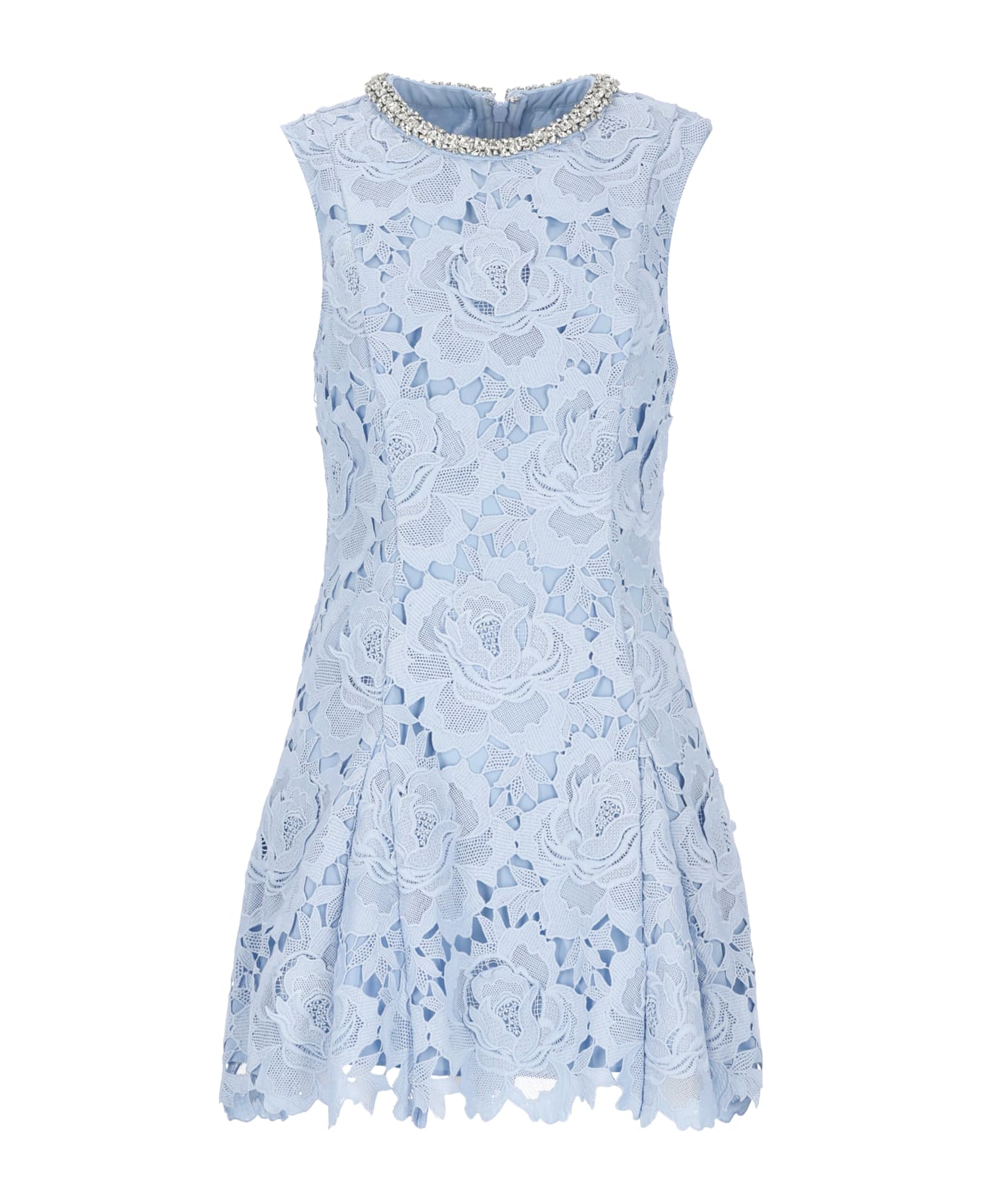 - Light blu Self Portrait dress for woman - Sleeveless - Round neck with strass - All-over lace floral pattern - Rear zip fastening