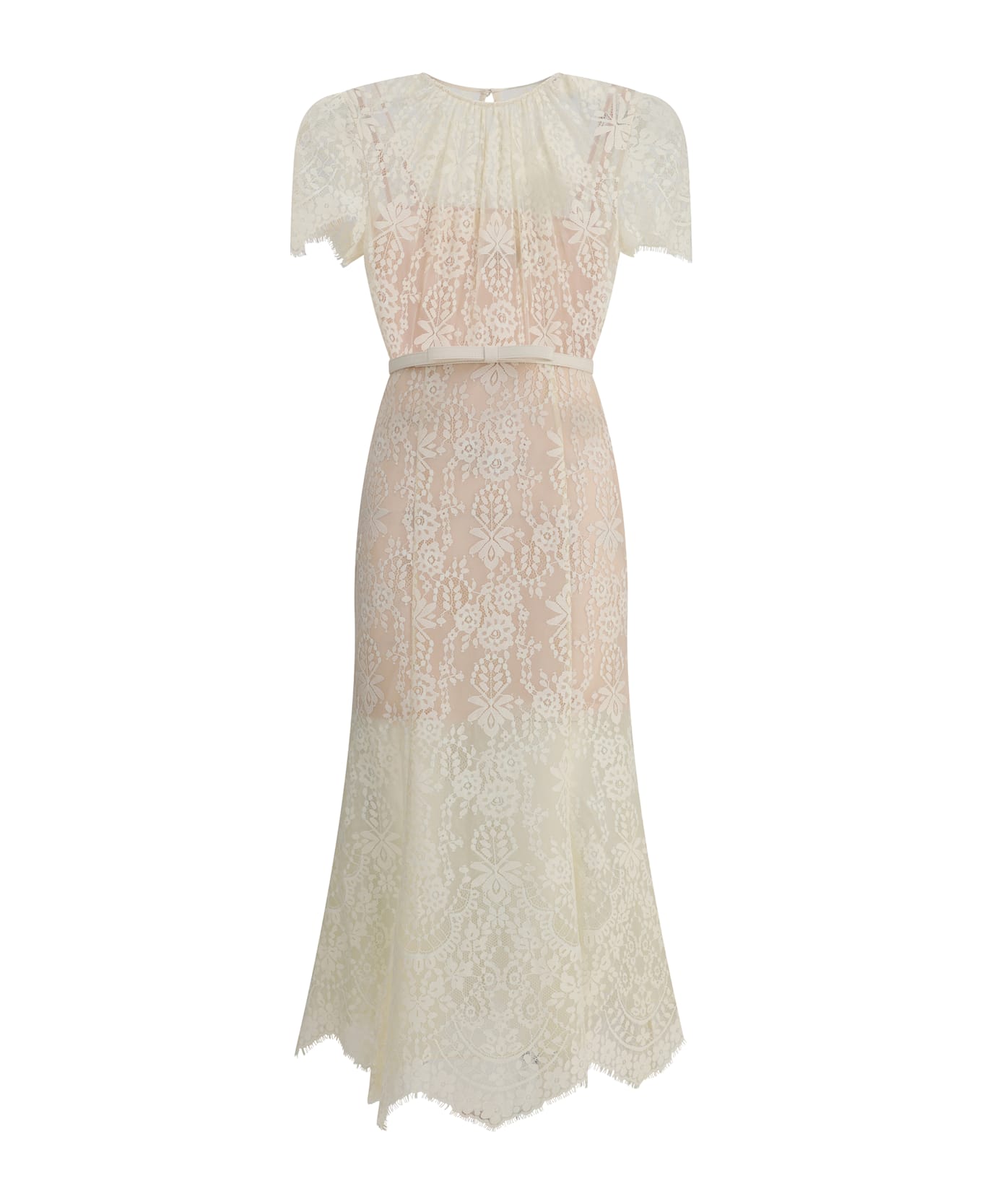 Self-portrait's lace midi dress is an elegant and feminine piece perfect for special occasions or sophisticated evenings. featuring exquisite worked lace and a figure-flattering midi silhouette, it has short sleeves and a round neckline that accentuate its delicacy. the back zipper closure ensures a comfortable and precise fit, while the removable inner lining allows you to customize the look to suit the occasion. completing the design is an adjustable and removable belt, ideal for defining the waist and adding an extra touch of style.