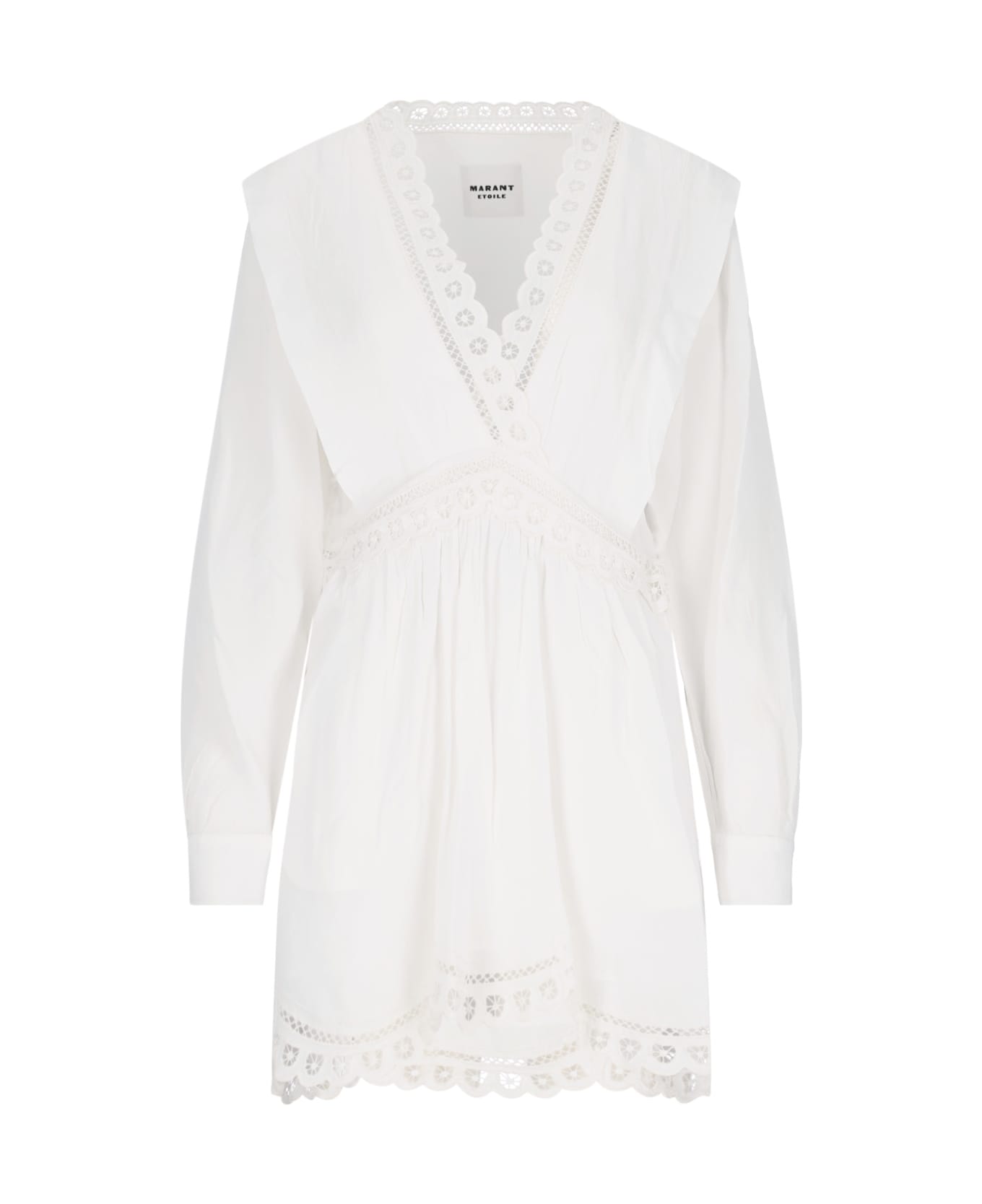 Isabel Marant Etoile lace mini dress in white viscose crêpe with tonal lace trim, V-neck, structured shoulders, button cuffs, tight waistband appliqué, draped details, two side pockets, side zip closure, straight hem.