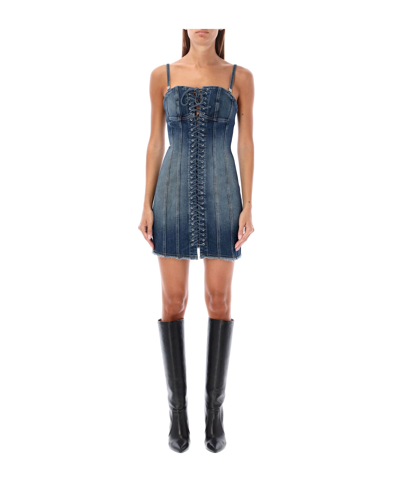 Lara Laced Denim Mini Dress By Misbhv. Featuring: Wash Denim Lacing At Front Adjustable Straps With Rhinestone Metal Logo Zip Closure At Back Fringed Hem Model Is 1,72 M And Wears Size S