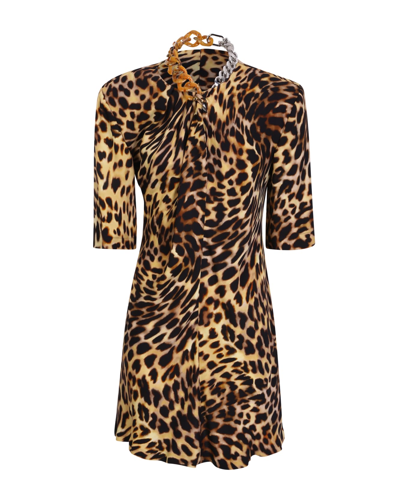 Roundneck. Short sleeves. Padded shoulders. Gathered detailing on the neck. Concealed rear zip fastening. All-over leopard print. Chain link detailing. Thigh length. Straight hem. CONSCIOUS. Color: multicolor