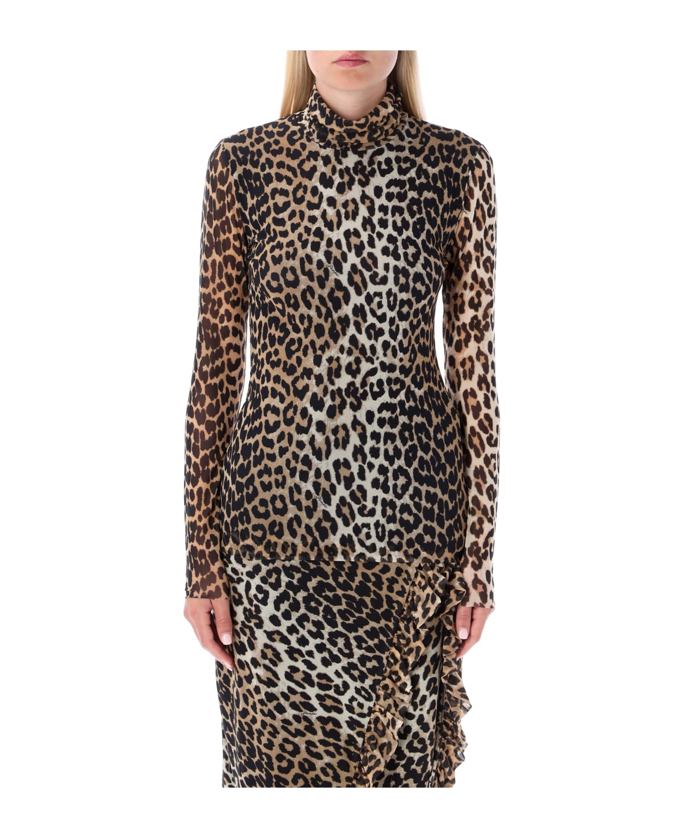 Stretch Leopard Print Turtleneck By Ganni. Featuring: Sheer Mesh Slip-on Style Turtleneck Long Sleeves Raw Cut Edges