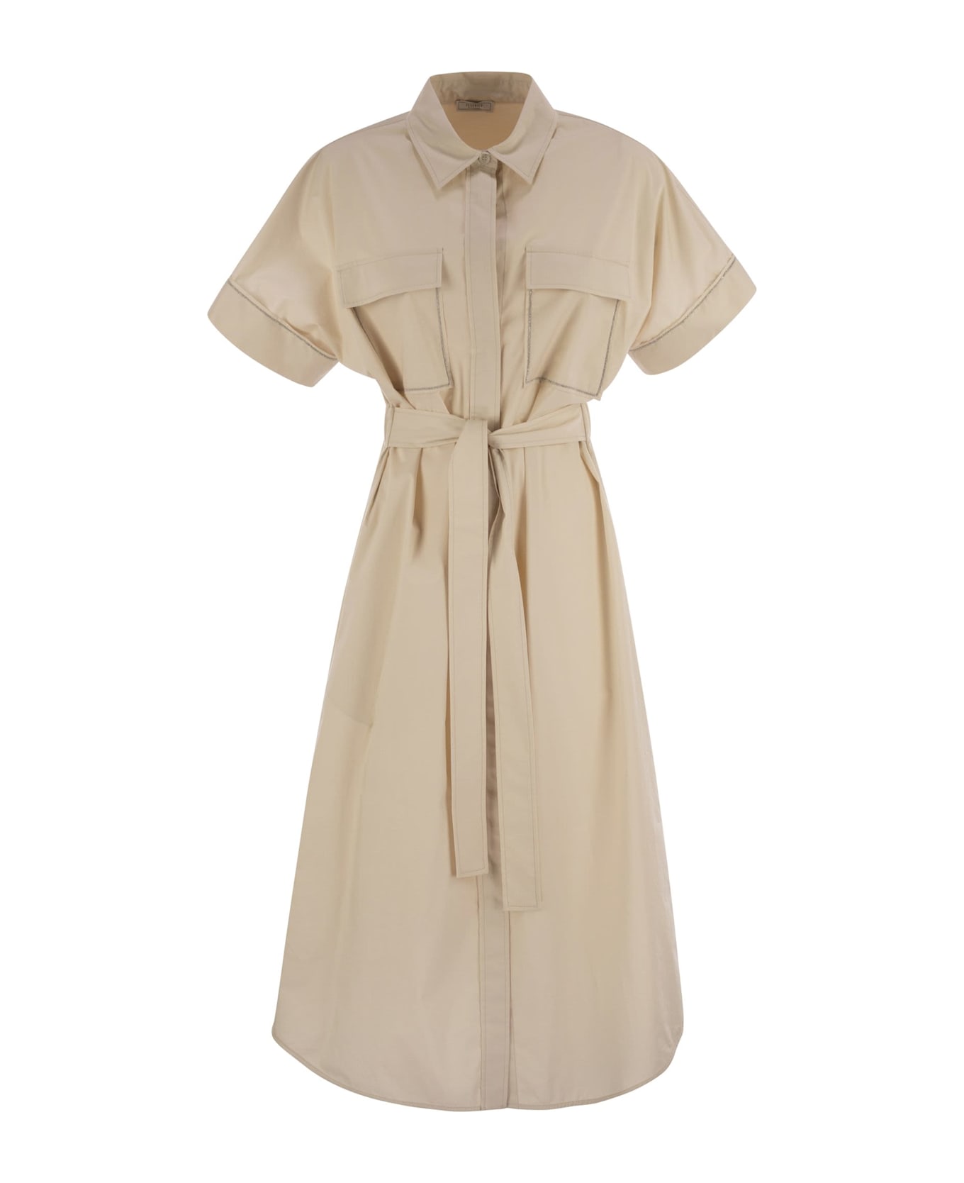 This lightweight stretch cotton satin 'sail hand' chemisier dress is distinguished by its refined, contemporary style. Short kimono sleeves with turn-ups lend a casual-chic look. The sail collar gently frames the neckline, while the fabric belt accentuates the silhouette, creating a feminine and harmonious line. The lightness and elasticity of the fabric make this garment comfortable and lightweight, perfect for facing the beginning of the hot summer season. Elegant and versatile, this dress can be worn casually both during the day and in the evening. - Chemisier dress with short kimono sleeve - Sail collar - Light stitch on sleeve lapel and patch pockets - Regular fit - Fabric belt on front waist - Elasticized back waist - Hidden button front closure DESIGNER ID: S0266601979 142