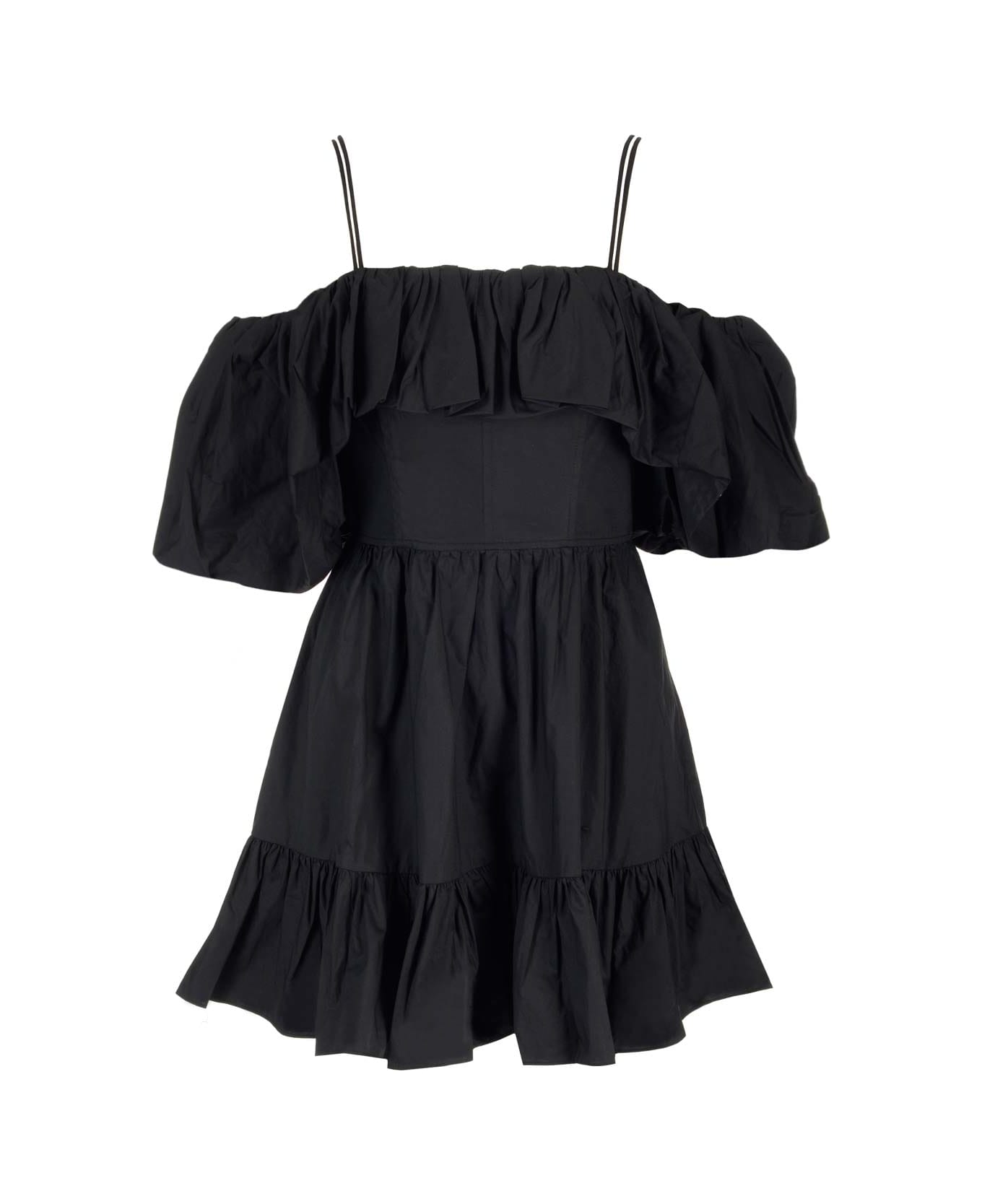Black cotton popelin "Lila" mini dress from Ulla Johnson with spaghetti straps, gathered ruffle on the shoulders, short flared skirt.