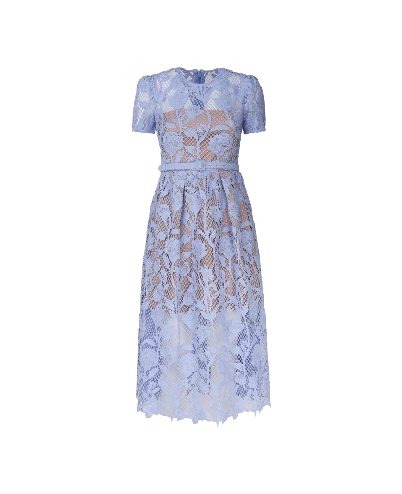 -Floral lace detailing -Round neckline -Short sleeves -Belted style -Concealed back zipper closure -Length below the knee -Color: Blue