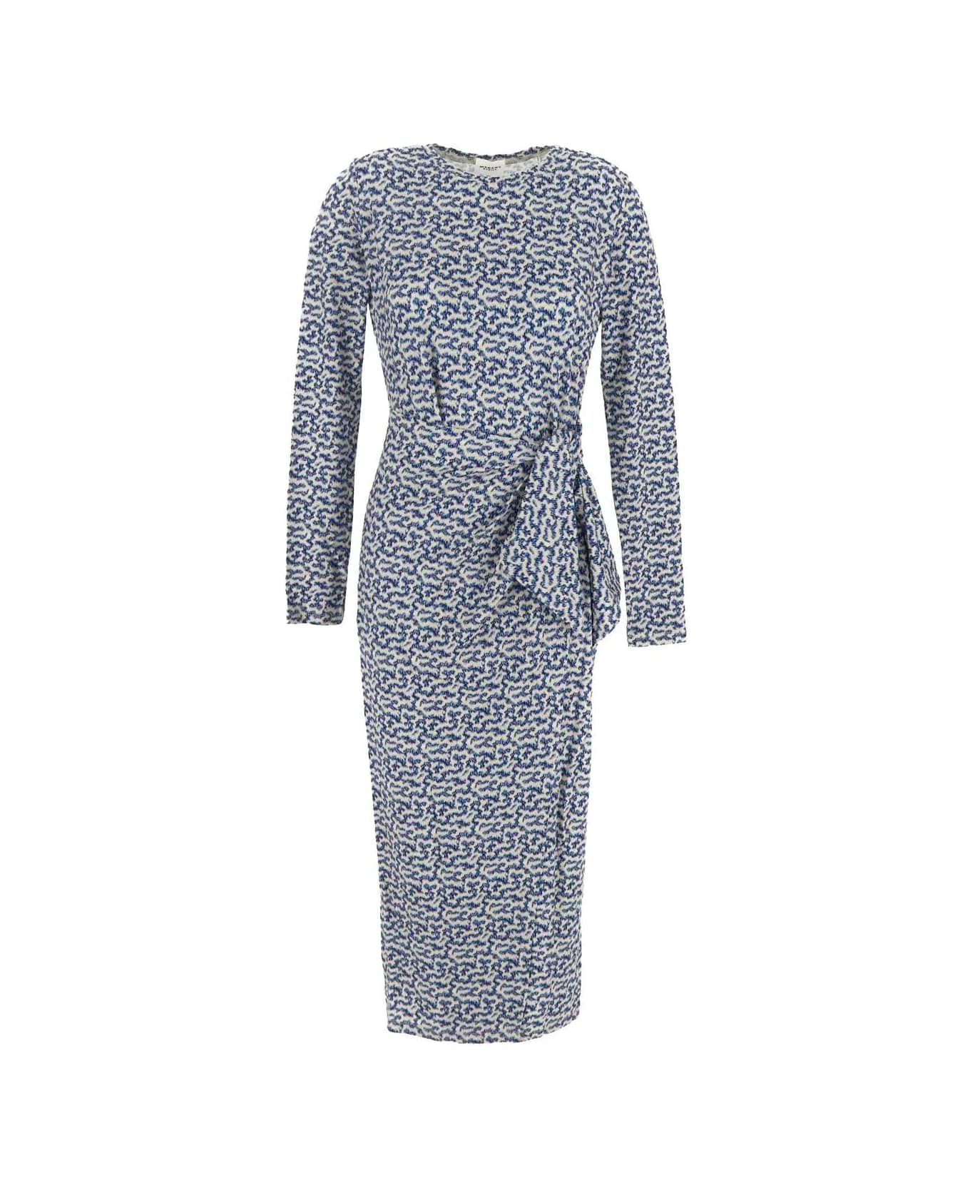 Isabel Marant Etoile wrap-around midi dress in blue/ecru viscose with abstract print, long sleeves, a round neckline, tight fit and bands to tied at side creating a draped skirt effect.