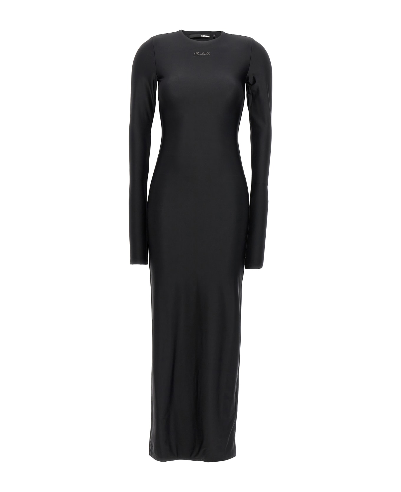 Lycra dress with rhinestone logo on the front, crewneck and long sleeves.