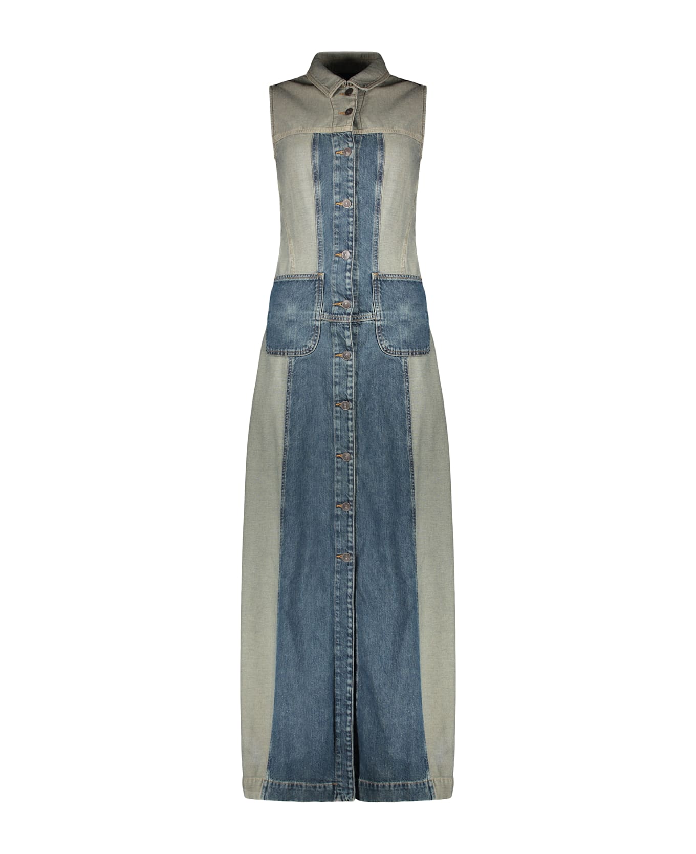 This long denim dress features a modern silhouette and a comfortable fit. it is characterized by a front closure with buttons and a shirt collar that adds a casual touch. the design is enhanced with fabric details that create a contrast effect. the wide straps ensure greater comfort, while the side pockets offer functionality. perfect to pair with sporty shoes or sandals for a versatile summer look. ideal for casual occasions and for everyday use. 100% cotton Composition: 100% % Cotton