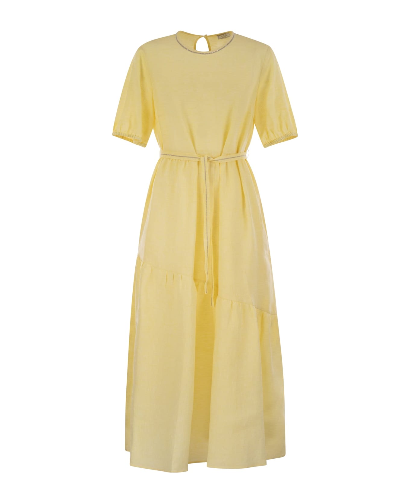 Made of lightweight pure linen canvas, this long dress is a refined and natural style choice. The garment features short sleeves gathered at the bottom, adding a romantic and feminine touch. The waist belt enhances the silhouette, while the asymmetrical flounce skirt gives a flowing and harmonious fall, ensuring comfort and freedom of movement. Completing the design of the garment are the luminous details on the neckline and fabric belt that embellish the dress, giving brightness. The freshness of the linen and the loose fit make this garment the ideal choice for facing hot summer days with elegance. - Long dress with short sleeves gathered at the bottom - Round neckline - Light stitch on neckline and fabric belt - Skirt with asymmetrical flounce - Loose fit - Button closure and back drop trim DESIGNER ID: S02163A02600 915