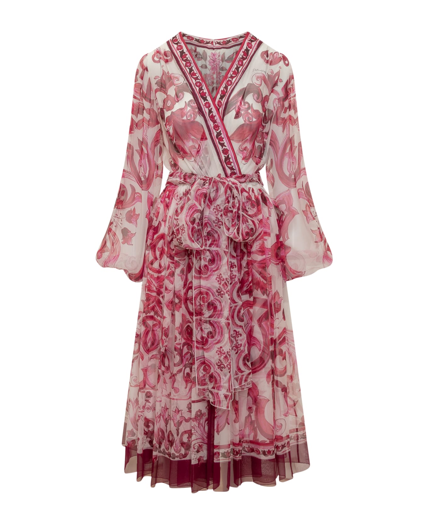 Long dress. Long sleeves. Elastic at the wrists. Zip closure on the back. Bandeau belt. Allover majolica print.
