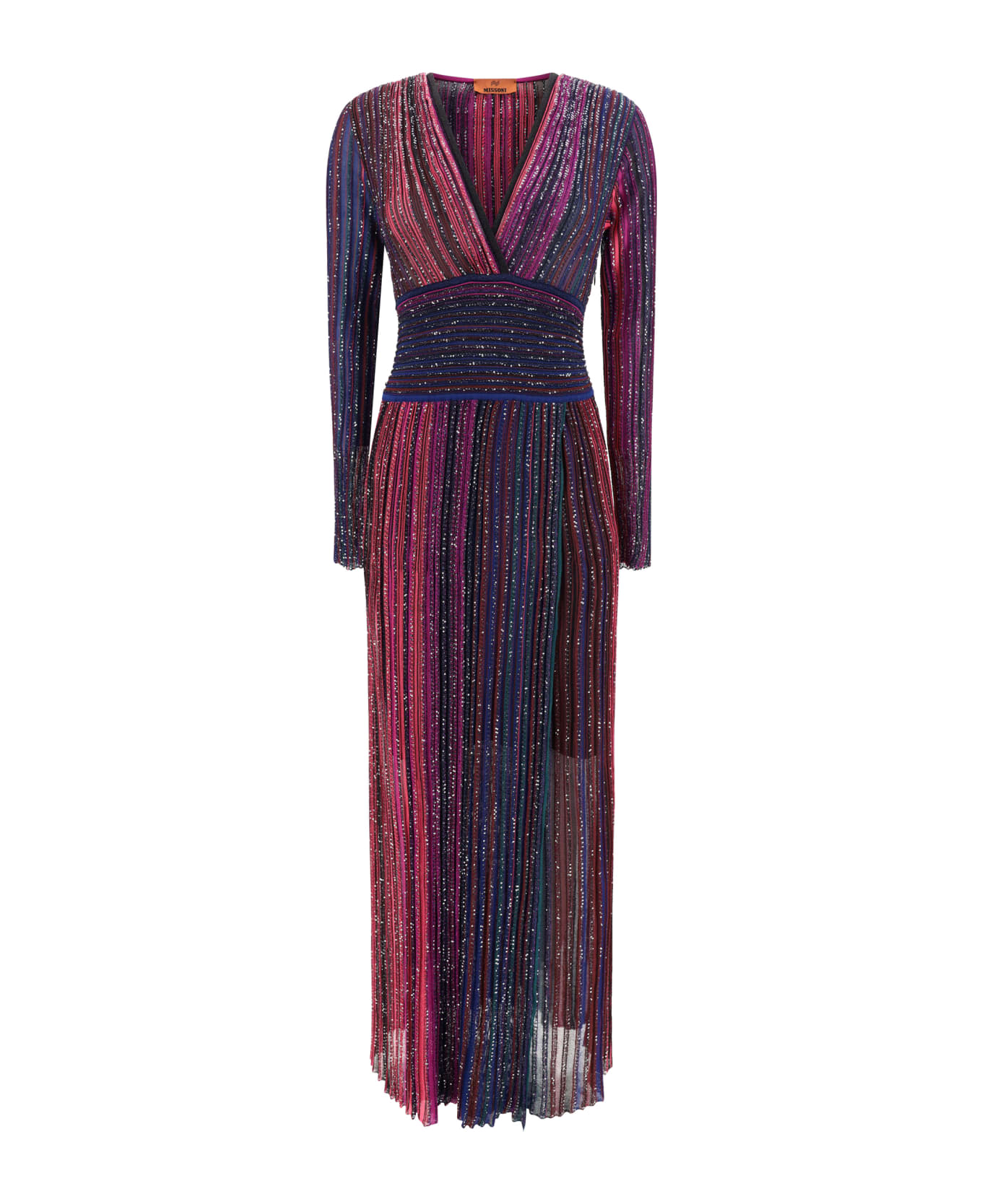 Long dress by missoni, multicolored striped pattern embellished with bright sequins, v-neck on the front, semi-transparent stretch fabric, floor-length model, regular fit.