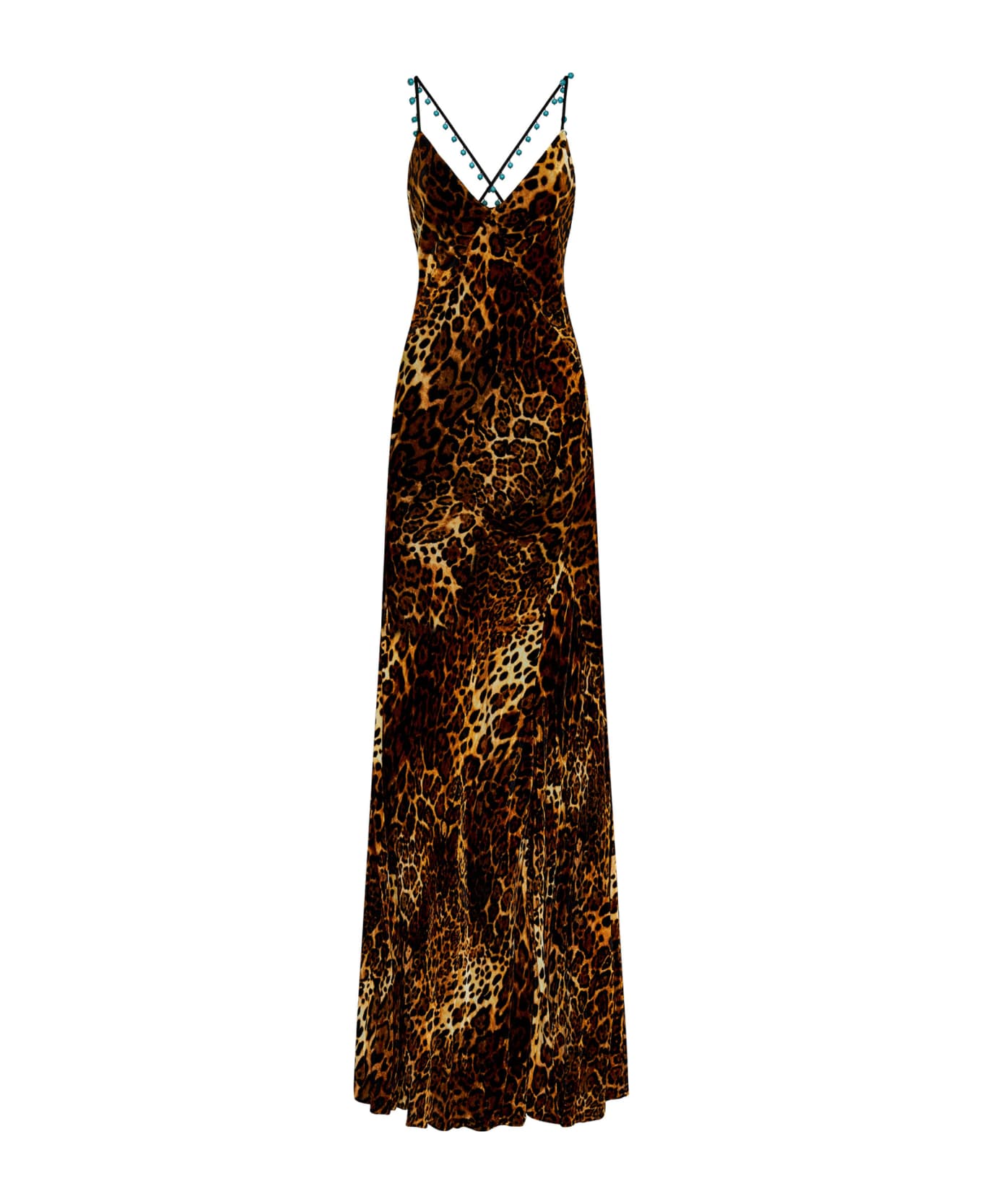 • V-neckline, low back; All-over turquoise bead-embellished black spaghetti straps, crossed at the back