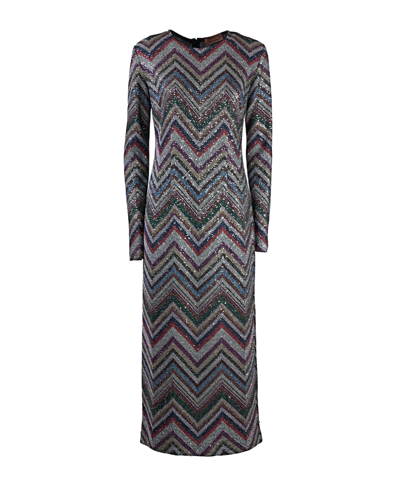 Missoni long dress. Knitted. Sequins. Round neck. Long sleeves. 1 button. Internal slip. Composition: 37% Viscose 30% Polyamide 25% Polyester 8% Cupro. Made in Italy.