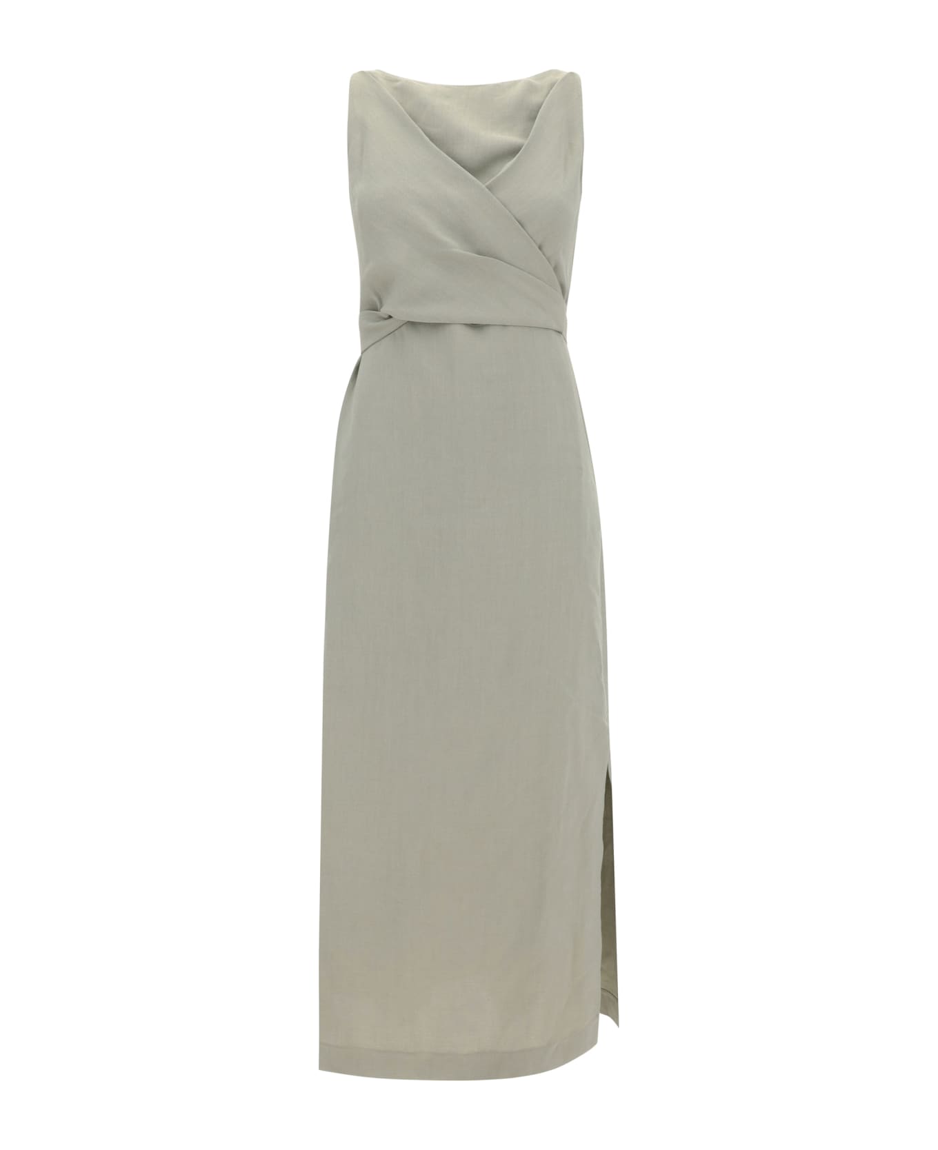 Long dress by brunello cucinelli, sleeveless design, concealed back panel zipper closure, boat neckline, attached belt to tie at front, deep side slit, monochrome pattern, regular fit. Composition: 73% % Viscose, 27% % Lino *sost Con Li*