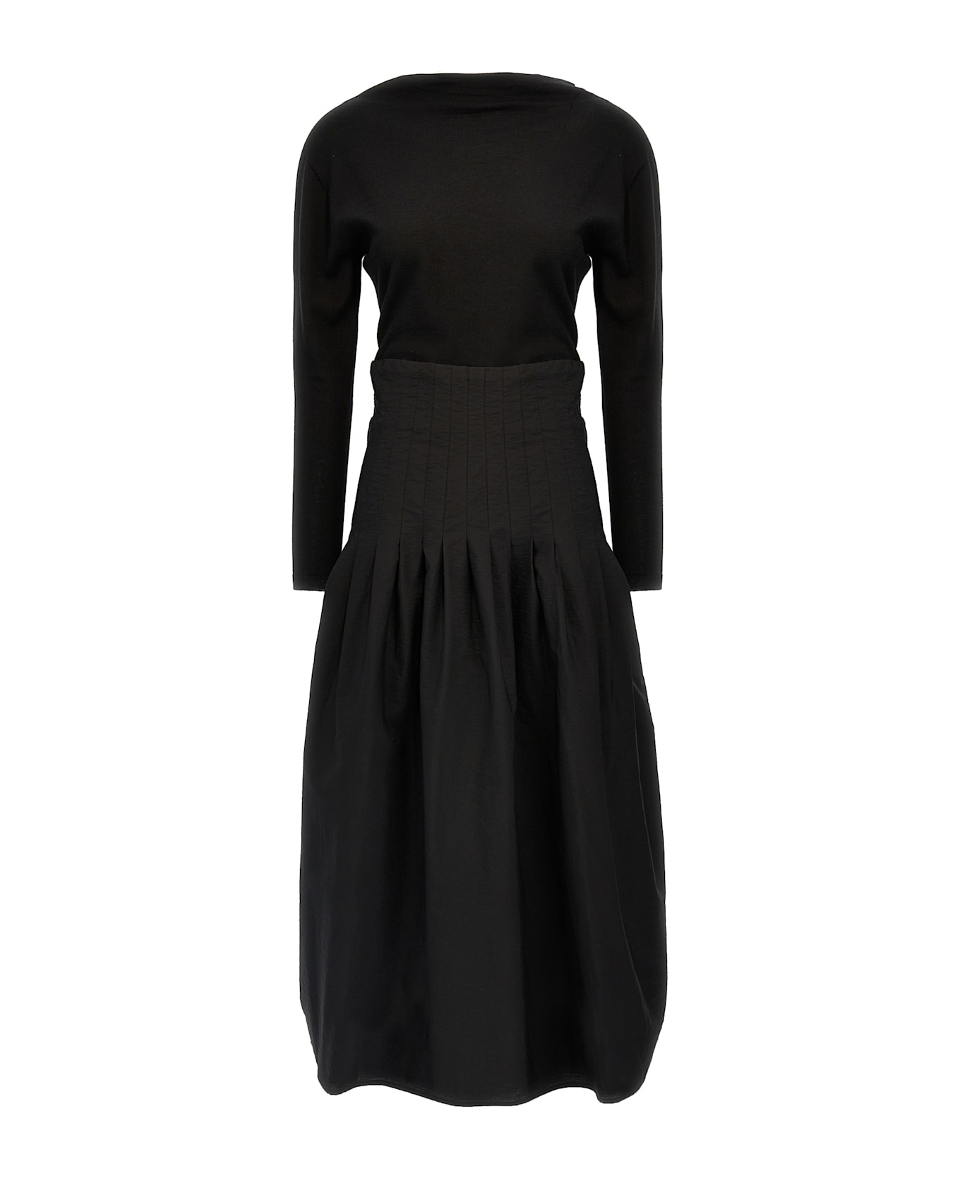 Long dress with wool knit top, plunging back neckline, pleated skirt, long sleeves Composition: 53% wool 47% cotton