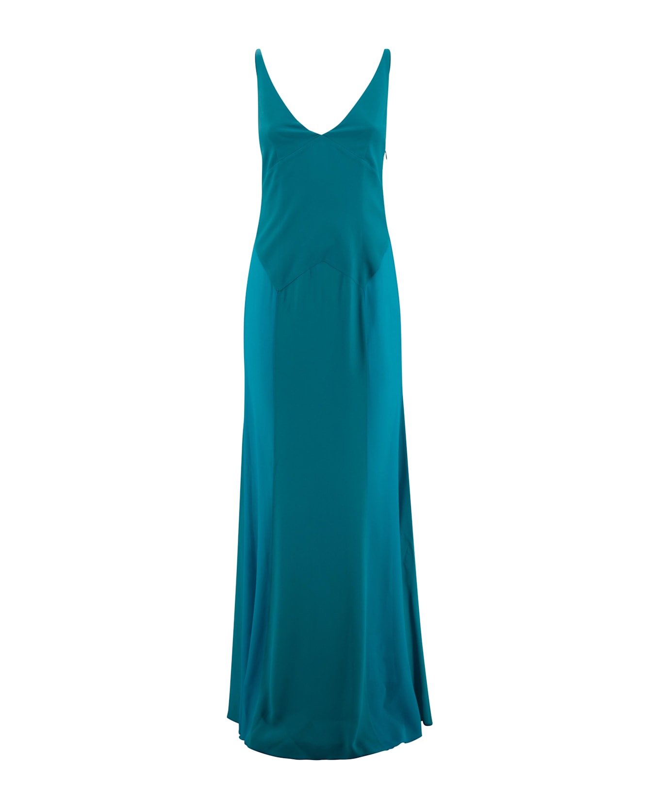 Long dress in double fabric, regular fit, V-neck and side fastening with concealed zip