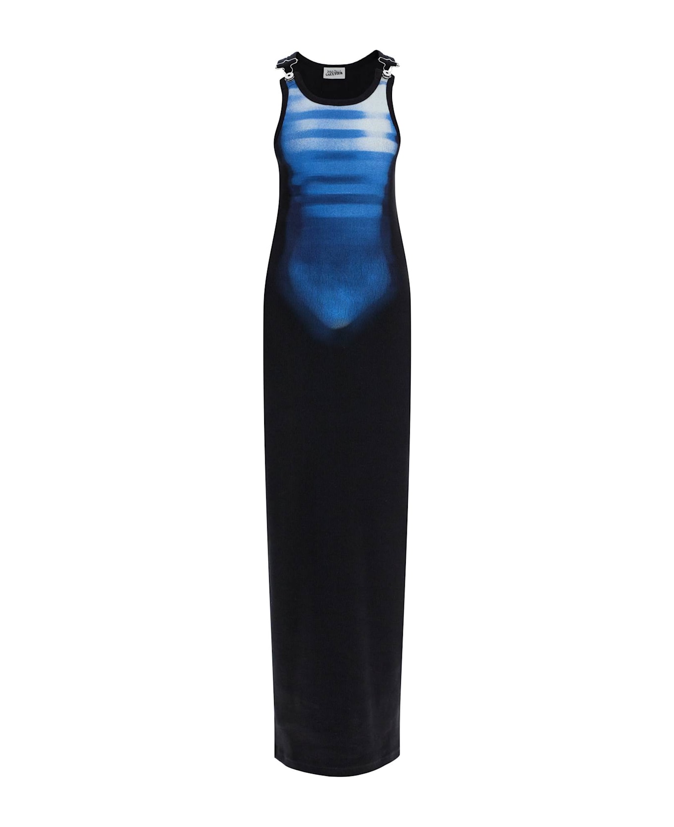 The long dress 'Le Male' by JEAN PAUL GAULTIER is a masterpiece in ribbed cotton. Fitted and versatile, it features a print of blue on black. Ideal for casual-chic and formal looks.