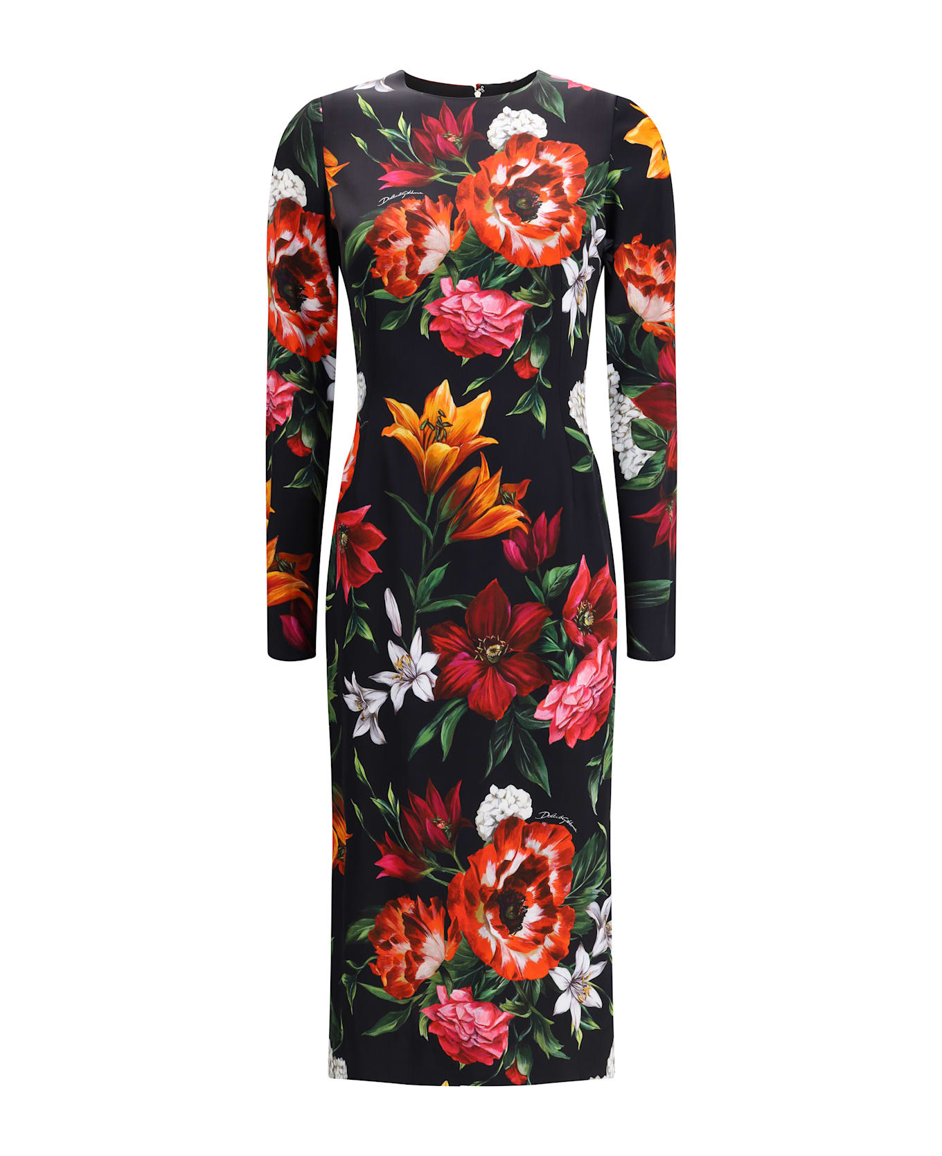 Dolce&gabbana's long dress features an elegant and feminine design with long sleeves and an invisible back zipper closure. made of lightweight fabric with a vibrant multicolored floral pattern, it is embellished with the brand's iconic signature printed on the front and back. a distinctive garment, perfect for special occasions or refined looks.