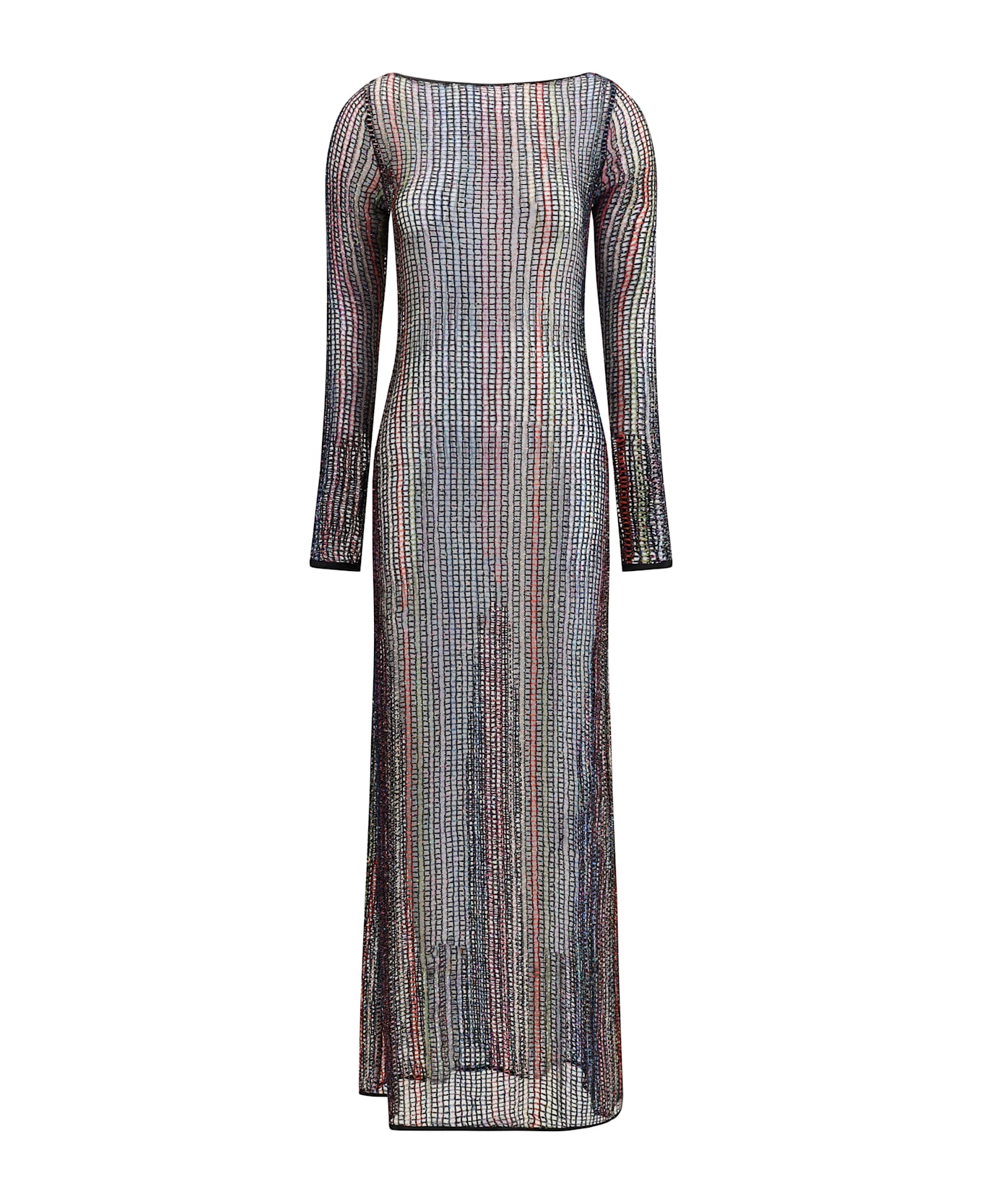 Missoni long dress with a unique design, made of perforated mesh knit embellished with all-over applied multicolor sequins for a bright and vibrant effect. the model features long sleeves and a deep round neckline at the back, giving a touch of sensuality and elegance. the straight hemline completes the garment, perfect for special occasions and sophisticated evenings.