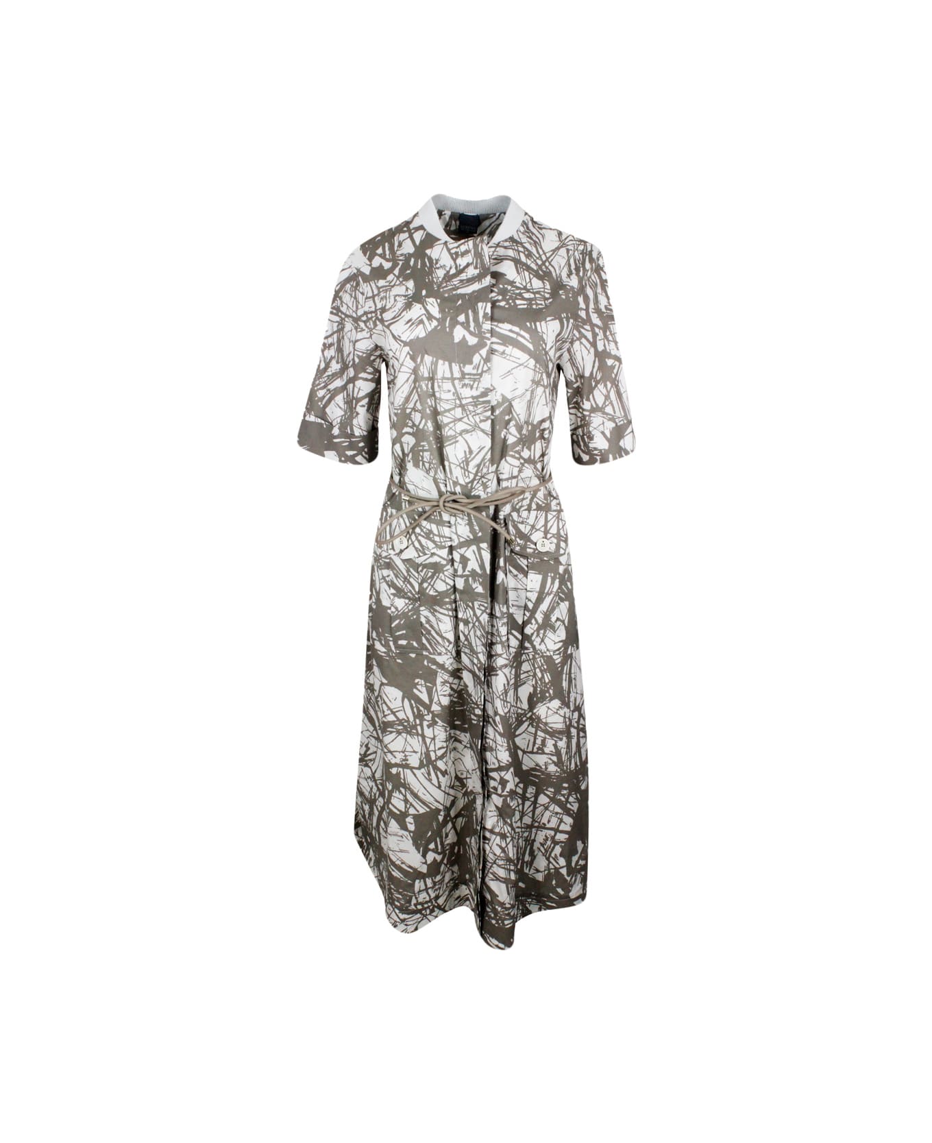 Long Patterned Short Sleeve Dress With Button Closure And Leather Belt