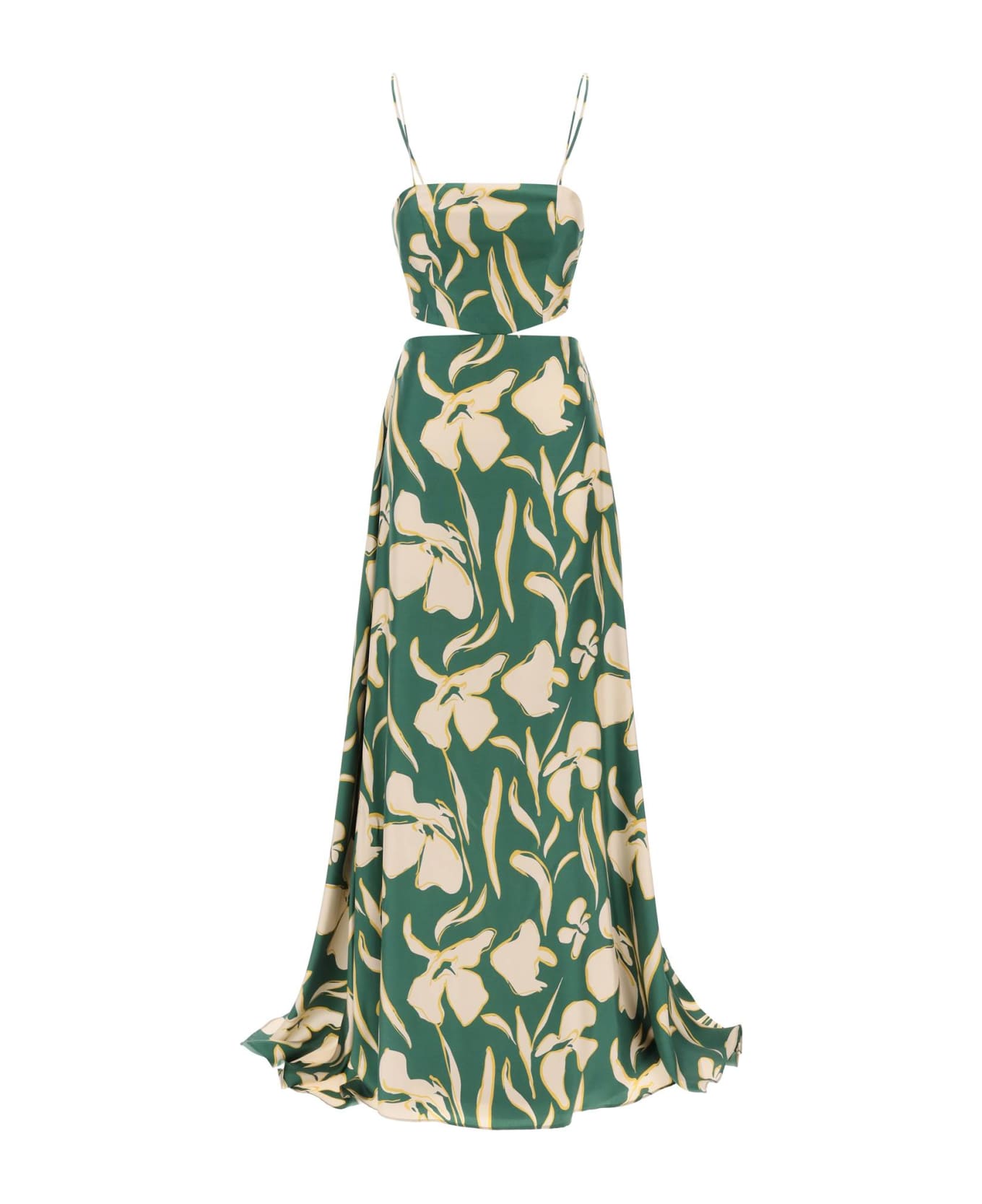 The Bali long dress by Raquel Diniz is made of pure silk twill with a floral print. It features a flared design, finished with cut-outs on the bust and a bow to tie at the back. Thin straps, square neckline on the front and wide on the back. The model is 177 cm tall and wears size IT 40.