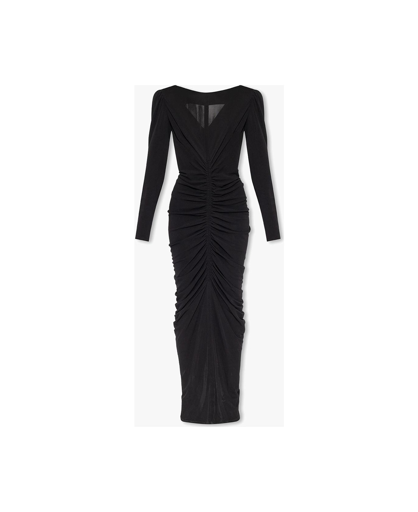 Black dress from Givenchy. Distinguished by draping, this style features a back zipper with a hook & eye closure, padded shoulders and long sleeves.