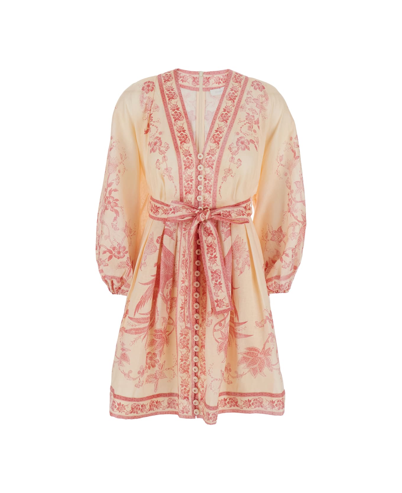 Mini dress Pink V neck Long puffed sleeves Front belt Rear zip closure Straight hem Linen Relaxed fit