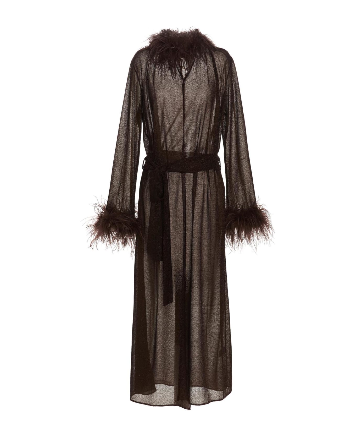 Lumiere' long lurex cashmere with feather appliqué on the hem, a crewneck, sleeves, long sleeves and a belt at the waist.