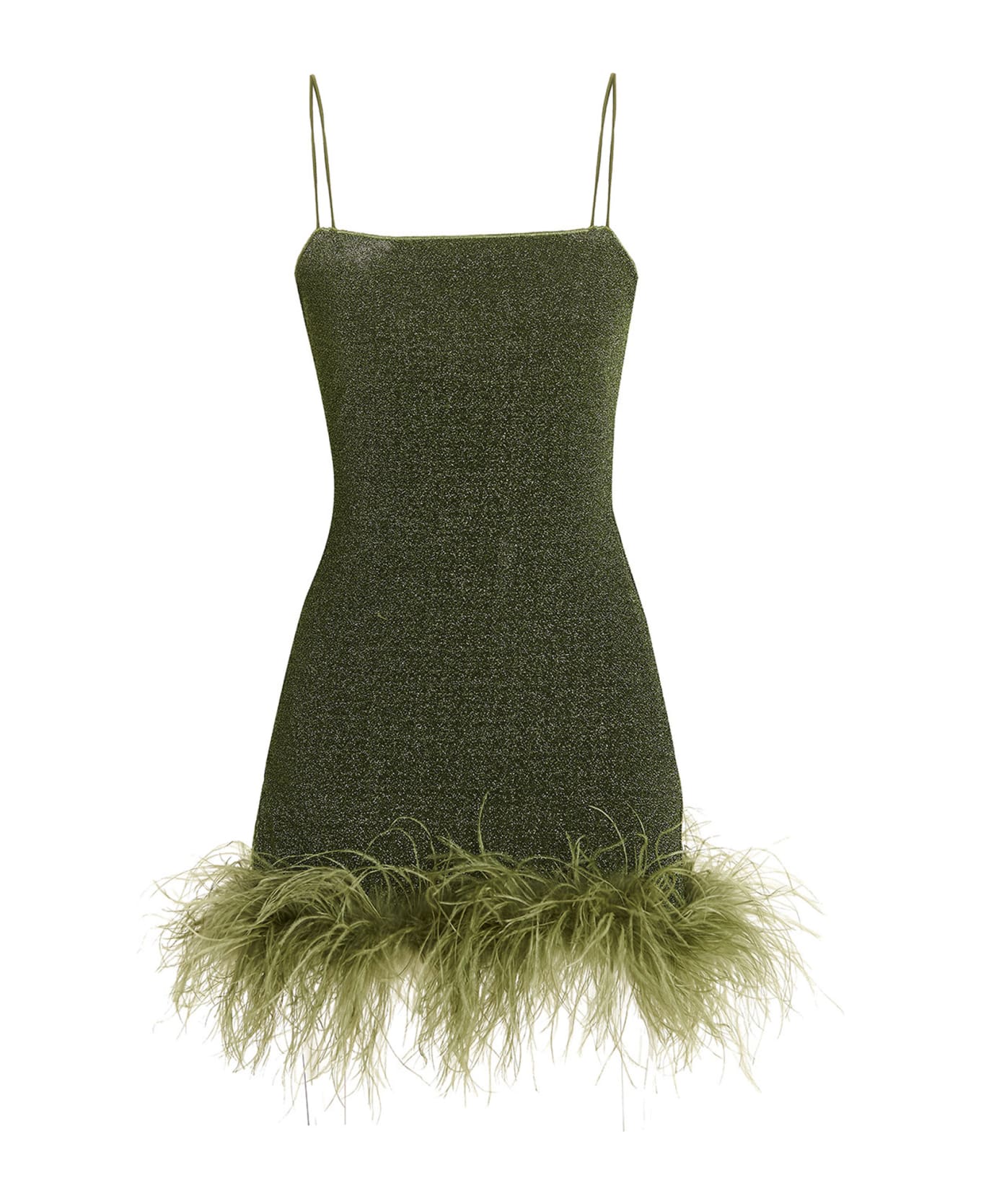 'Lumiere Plumage' minidress in lined lurex with thin straps, feather appliqué at the hem.