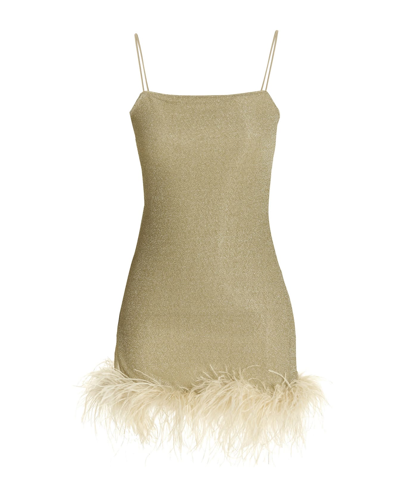 'Lumiere Plumage' minidress in lined lurex with thin straps, feather appliqué at the hem.