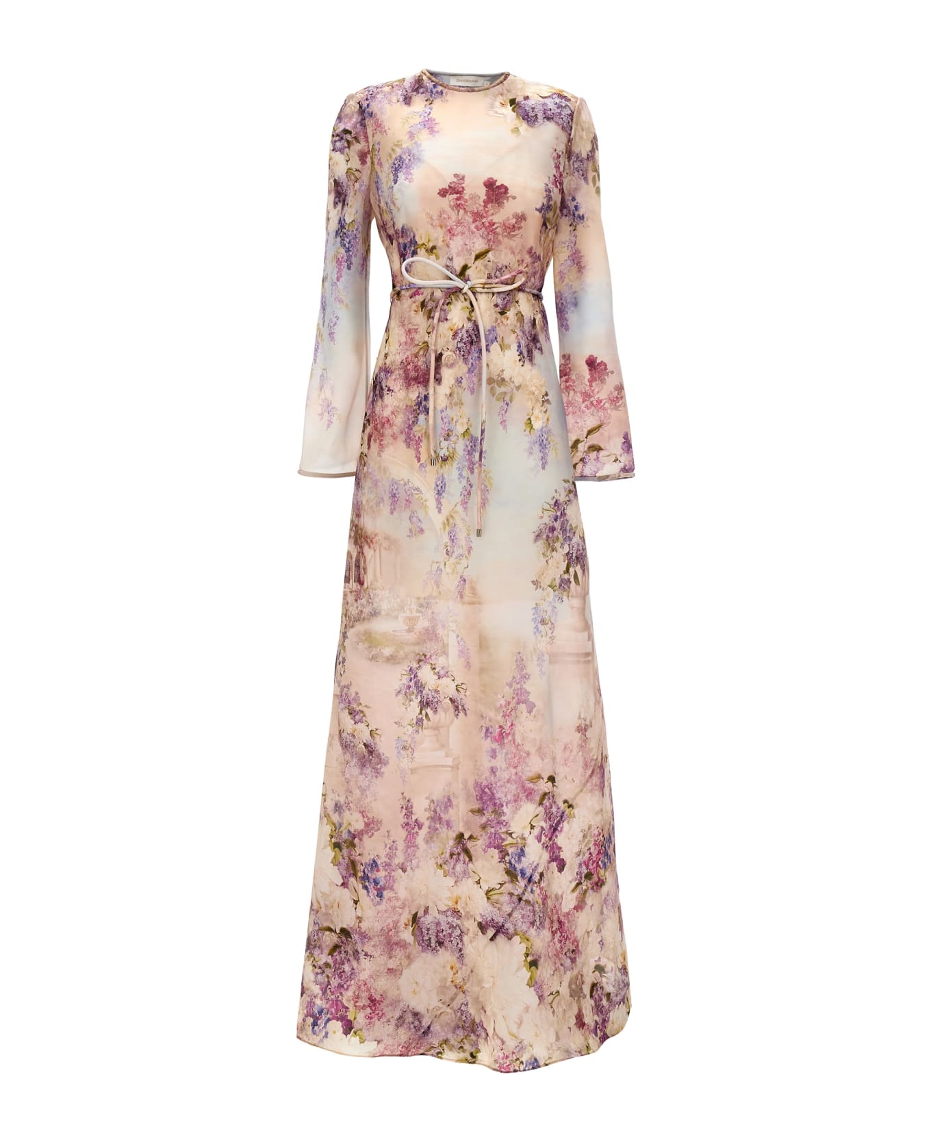 'Luminosity Bias Slip' floral print silk dress with crew neck, long sleeves, matching waist belt, and shoulder zipper closure.